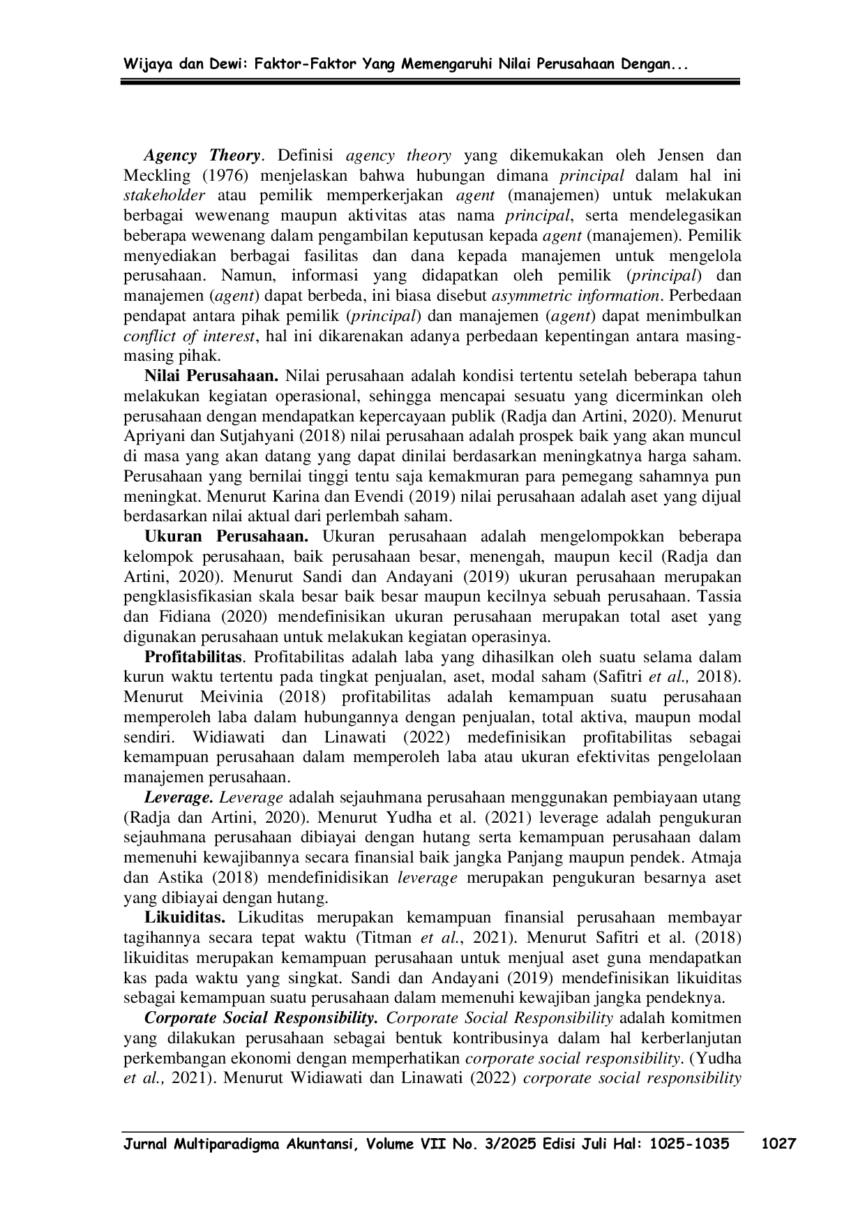 Jurnal Komunikasi bidang kajian ilmu komunikasiJurnal Komunikasi bidang kajian ilmu komunikasiPenelitian ini bertujuan untuk mengetahui bagaimana peran ukuran perusahaan, profitabilitas, leverage, dan likuiditas terhadap nilai perusahaan dengan menggunakan tanggungjawab sosial sebagai variabel moderasi pada sektor konsumsi barang non primer yang terdaftar di Bursa Efek Indonesia selama tahun 2019-2021. Sampel dipilih dengan metode purposive sampling dan data yang valid ada 17 perusahaan. Teknik pengolahan data menggunakan analisis regresi moderasi (MRA) yang dibantu oleh program Eviews 12.0 dan Microsoft Excel 2013. Hasil penelitian ini menunjukkan bahwa ukuran perusahaan tidak berpengaruh negatif terhadap nilai perusahaan, profitabilitas dan tanggungjawab sosial berpengaruh positif terhadap nilai perusahaan, leverage dan likuiditas tidak berpengaruh positif terhadap nilai perusahaan. Tanggungjawab sosial dapat memengaruhi pengaruh ukuran perusahaan terhadap nilai perusahaan, tanggungjawab sosial tidak dapat memengaruhi pengaruh likuiditas terhadap nilai perusahaan.