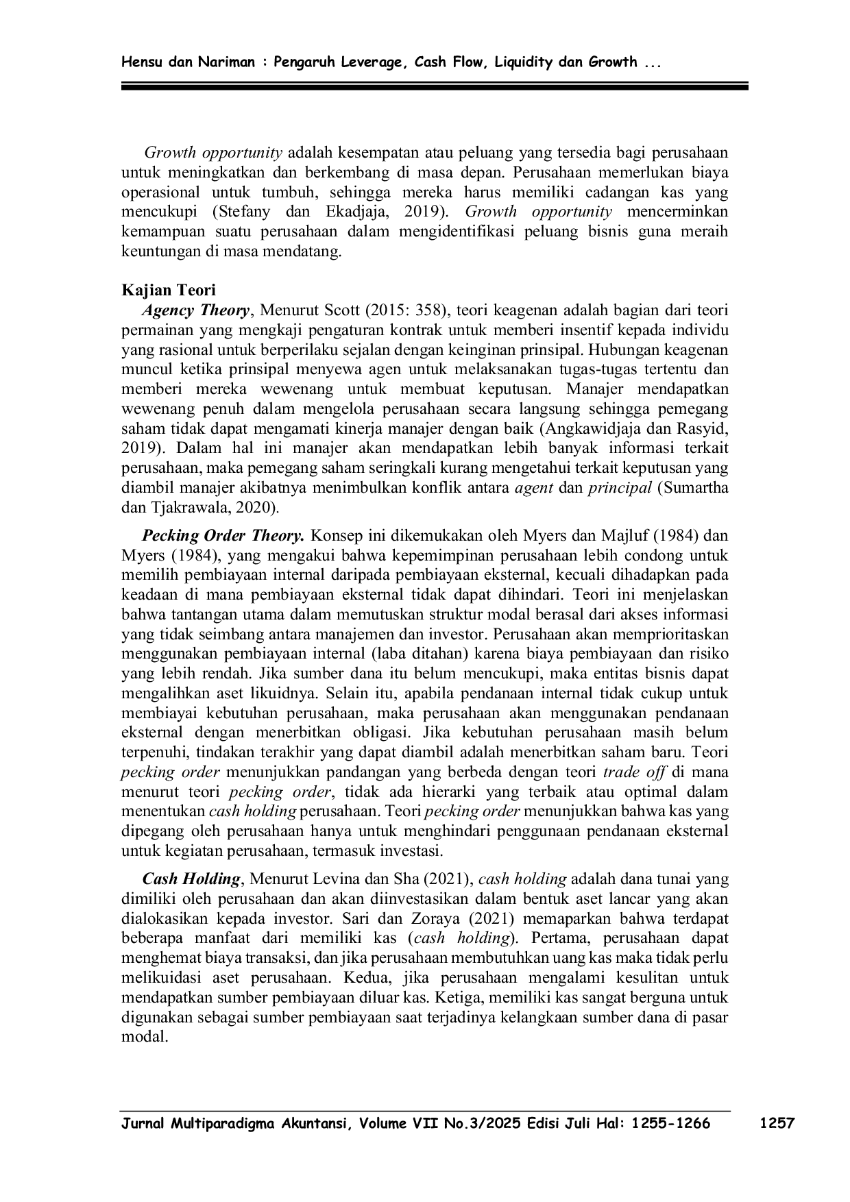 Jurnal Komunikasi bidang kajian ilmu komunikasiJurnal Komunikasi bidang kajian ilmu komunikasiPenelitian ini bertujuan untuk menemukan bukti empiris mengenai dampak leverage, cash flow, liquidity dan growth opportunity terhadap cash holding pada infrastruktur industri manufaktur perusahaan yang terdaftar di Bursa Efek Indonesia periode 2019-2020. Sampel dipilih dengan menggunakan metode purposive sampling, dan data yang valid terdiri dari 121 sampel perusahaan selama rentang waktu 3 tahun. Data diolah menggunakan SPSS (Statistical Product and Service Solution) versi 22 untuk Windows dan Microsoft Excel 2013. Hasil uji F menunjukkan bahwa leverage, cash flow, liquidity dan growth opportunity berpengaruh signifikan terhadap cadangan kas. Implikasi dari penelitian ini menunjukkan bahwa semua variabel independen secara kolektif mampu memprediksi cash holding. Pengujian parsial mengungkapkan bahwa leverage dan cash flow menunjukkan pengaruh positif dan tidak signifikan terhadap cash holding, liquidity berpengaruh positif dan signifikan terhadap cash holding, growth opportunity berpengaruh negatif dan tidak signifikan terhadap cash holding.