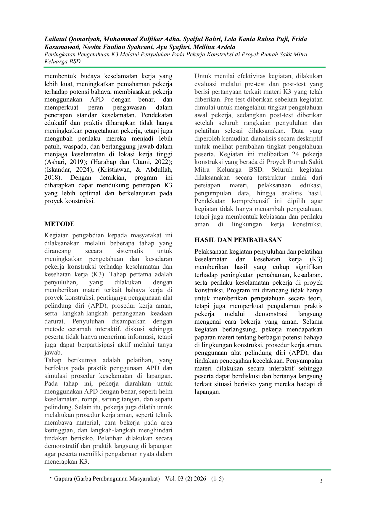 Gapura (Garba Pembangunan Masyarakat)Gapura (Garba Pembangunan Masyarakat)Kegiatan pengabdian kepada masyarakat ini bertujuan untuk meningkatkan pengetahuan dan kepatuhan pekerja konstruksi terhadap keselamatan dan kesehatan kerja (K3) melalui penyuluhan di Proyek Rumah Sakit Mitra Keluarga BSD PT. Tatamulia Nusantara Indah. Metode kegiatan meliputi penyuluhan K3, pelatihan penggunaan APD, serta evaluasi melalui pre-test dan post-test. Sebanyak 24 pekerja mengikuti kegiatan ini. Hasil menunjukkan peningkatan skor pengetahuan dari nilai rata-rata pre-test 94,1 menjadi 91,25 pada post-test, serta 79% pekerja mengalami peningkatan nilai setelah pelatihan. Pelatihan juga meningkatkan pemahaman terkait bahaya kerja, prosedur keselamatan, dan penggunaan APD. Dengan demikian, program penyuluhan dan pelatihan K3 terbukti efektif meningkatkan kesadaran dan kemampuan pekerja dalam menerapkan keselamatan kerja. Kegiatan ini direkomendasikan untuk dilakukan secara berkala guna memperkuat budaya K3 di proyek konstruksi.