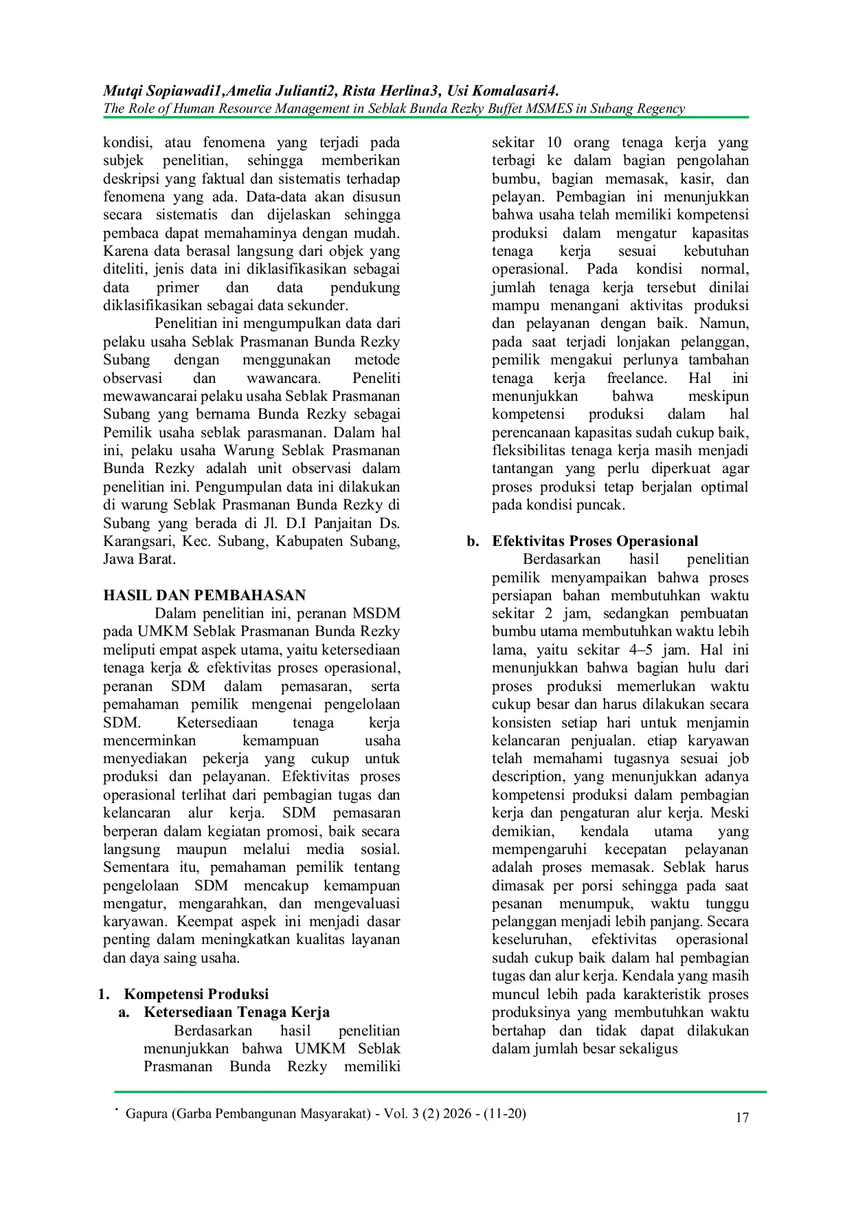 Gapura (Garba Pembangunan Masyarakat)Gapura (Garba Pembangunan Masyarakat)Usaha Mikro, Kecil, dan Menengah (UMKM) memiliki peran penting dalam perekonomian daerah, terutama dalam penyerapan tenaga kerja. Keberhasilan UMKM tidak hanya ditentukan oleh kualitas produk, tetapi juga oleh pengelolaan sumber daya manusia (SDM). Penelitian ini bertujuan menganalisis peranan Manajemen Sumber Daya Manusia (MSDM) pada UMKM Seblak Prasmanan Bunda Rezky di Kabupaten Subang berdasarkan kompetensi produksi, pemasaran, dan kewirausahaan. Penelitian menggunakan metode deskriptif kualitatif melalui observasi dan wawancara dengan pemilik usaha. Hasil penelitian menunjukkan bahwa kompetensi produksi sudah cukup baik, namun masih terkendala fleksibilitas tenaga kerja dan proses memasak per porsi. Kompetensi pemasaran belum optimal karena belum didukung SDM khusus, sedangkan kompetensi kewirausahaan pemilik tergolong baik. Penelitian ini menyimpulkan bahwa penguatan MSDM, khususnya pada aspek pemasaran dan sistem operasional, diperlukan untuk meningkatkan daya saing dan keberlanjutan usaha.