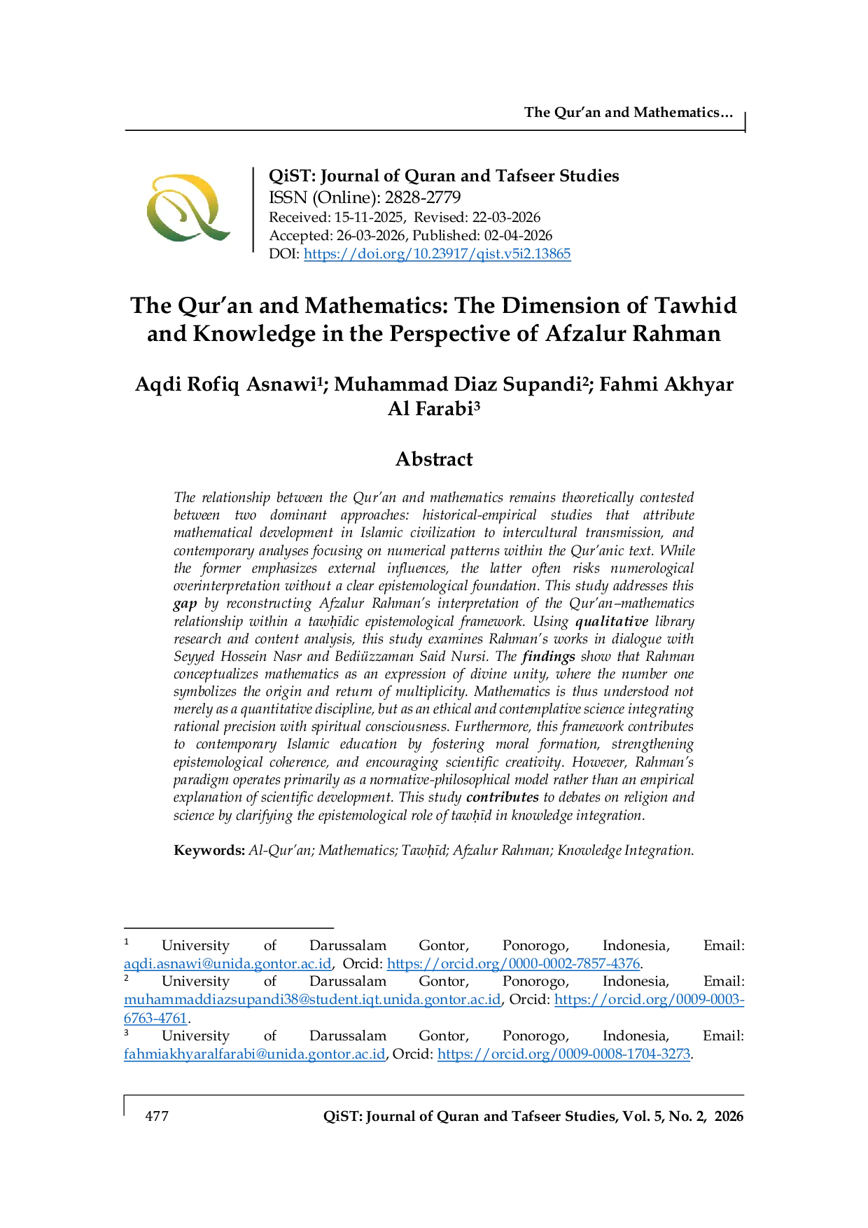 - The Qur'an and Mathematics: The Dimension of Tawhid and Knowledge in the Perspective of Afzalur... doi.org/10.23917/qist.v5i2.13865The Quran and Mathematics The Dimension of Tawhid and Knowledge in the Perspective of Afzalur doi 10 23917 qist v5i2 13865