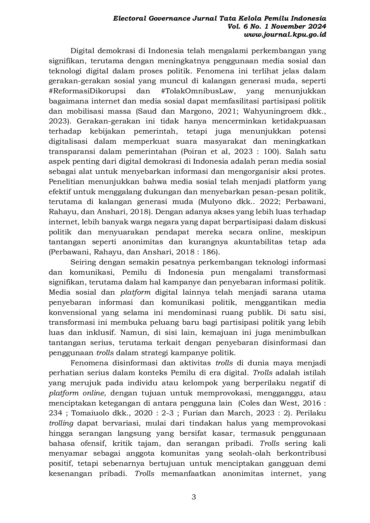 Electoral Governance Jurnal Tata Kelola Pemilu IndonesiaElectoral Governance Jurnal Tata Kelola Pemilu IndonesiaPemilu Serentak 2024 di Indonesia menghadapi tantangan besar dengan meningkatnya penggunaan trolls dan disinformasi sebagai bagian dari strategi kampanye politik. Penelitian ini bertujuan untuk menganalisis dampak kedua fenomena tersebut terhadap kualitas demokrasi digital, khususnya terkait persepsi pemilih dan integritas proses Pemilu. Melalui pendekatan kualitatif, penelitian ini mengeksplorasi konten media sosial dan melakukan wawancara mendalam dengan praktisi politik, penyelenggara Pemilu, dan pemilih. Hasil penelitian menunjukkan bahwa penggunaan trolls dalam kampanye memperkuat polarisasi politik di kalangan pemilih melalui penyebaran narasi provokatif. Disinformasi, yang disebarkan secara sistematis oleh aktor politik, terbukti memanipulasi persepsi publik terhadap kandidat dan isu-isu politik, sehingga mengaburkan batas antara informasi yang valid dan palsu. Temuan utama adalah adanya polarization tipping point, yaitu tingkat intensitas disinformasi yang dapat menyebabkan fragmentasi sosial yang sulit dipulihkan, serta berdampak negatif pada partisipasi pemilih dan kepercayaan publik terhadap Pemilu.