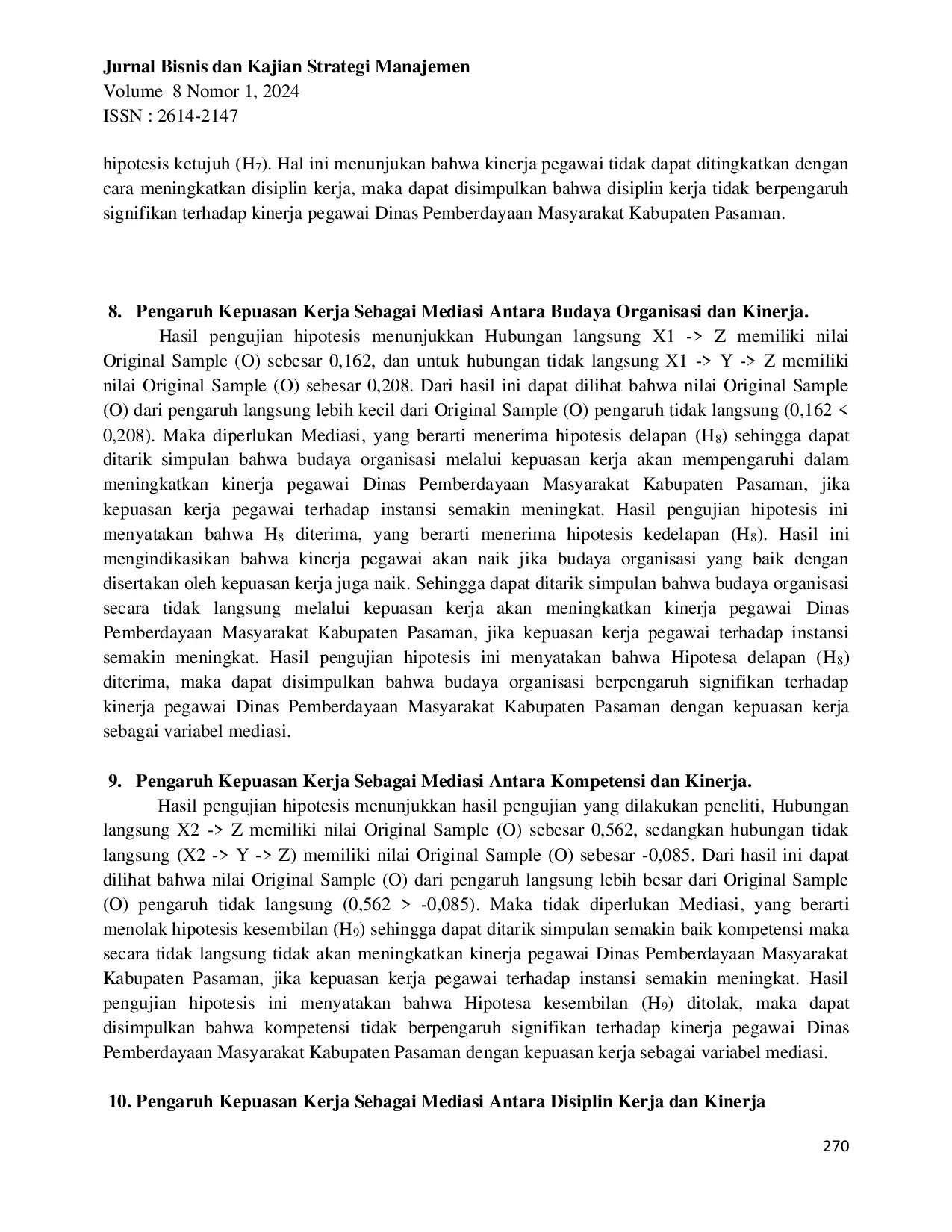 Jurnal Bisnis Dan Kajian Strategi ManajemenJurnal Bisnis Dan Kajian Strategi ManajemenPenelitian ini bertujuan untuk menganalisis pengaruh budaya organisasi, kompetensi dan disiplin kerja terhadap kinerja pegawai dengan kepuasan kerja sebagai mediasi pada Dinas Pemberdayaan Masyarakat Kabupaten Pasaman. Jenis penelitian menggunakan pendekatan kuantitatif dengan menggunakan pendekatan Partial Least Square dengan model persamaan Structural Equation Modeling. Teknik pengumpulan data dengan kuesioner dan observasi. Responden penelitian berjumlah 57 orang pegawai Dinas Pemberdayaan Masyarakat Kabupaten Pasaman. Metode penarikan sampel mengunakan metode total sampling. Pengujian hipotesis dihitung dengan program SmartPLS. Dari hasil penelitian ini ditemukan bahwa pengaruh langsung budaya organisasi berpengaruh positif dan signifikan terhadap kepuasan kerja, kompetensi dan disiplin kerja tidak berpengaruh positif dan signifikan terhadap kepuasan kerja, kepuasan kerja dan kompetensi berpengaruh positif dan signifikan terhadap kinerja, budaya organisasi dan disiplin kerja tidak berpengaruh positif dan signifikan terhadap kinerja. Pengaruh tidak langsung kepuasan kerja sebagai mediasi berpengaruh antara budaya organisasi dan kinerja serta berpengaruh antara disiplin kerja dan kinerja. Namun kepuasan kerja sebagai mediasi tidak berpengaruh antara kompetensi dan kinerja pegawai Dinas Pemberdayaan Masyarakat Kabupaten Pasaman.