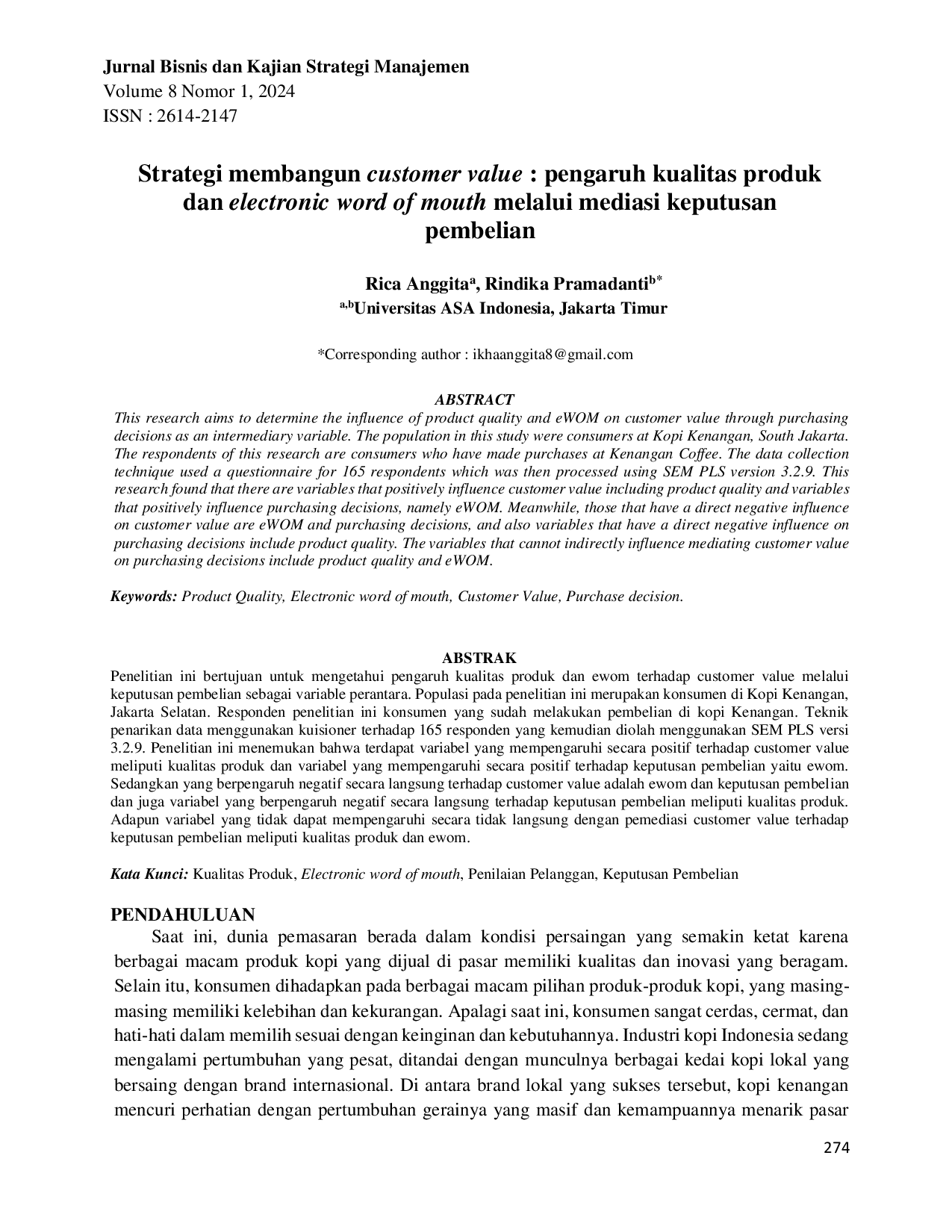 Jurnal Bisnis Dan Kajian Strategi ManajemenJurnal Bisnis Dan Kajian Strategi ManajemenPenelitian ini bertujuan untuk mengetahui pengaruh kualitas produk dan ewom terhadap customer value melalui keputusan pembelian sebagai variabel perantara. Populasi pada penelitian ini adalah konsumen di Kopi Kenangan, Jakarta Selatan. Responden penelitian ini adalah konsumen yang telah melakukan pembelian di Kopi Kenangan. Teknik penarikan data menggunakan kuisioner terhadap 165 responden yang kemudian diolah menggunakan SEM PLS versi 3.2.9. Penelitian ini menemukan bahwa terdapat variabel yang mempengaruhi secara positif terhadap customer value meliputi kualitas produk dan variabel yang mempengaruhi secara positif terhadap keputusan pembelian yaitu ewom. Sedangkan yang berpengaruh negatif secara langsung terhadap customer value adalah ewom dan keputusan pembelian dan juga variabel yang berpengaruh negatif secara langsung terhadap keputusan pembelian meliputi kualitas produk. Adapun variabel yang tidak dapat mempengaruhi secara tidak langsung dengan pemediasi customer value terhadap keputusan pembelian meliputi kualitas produk dan ewom.