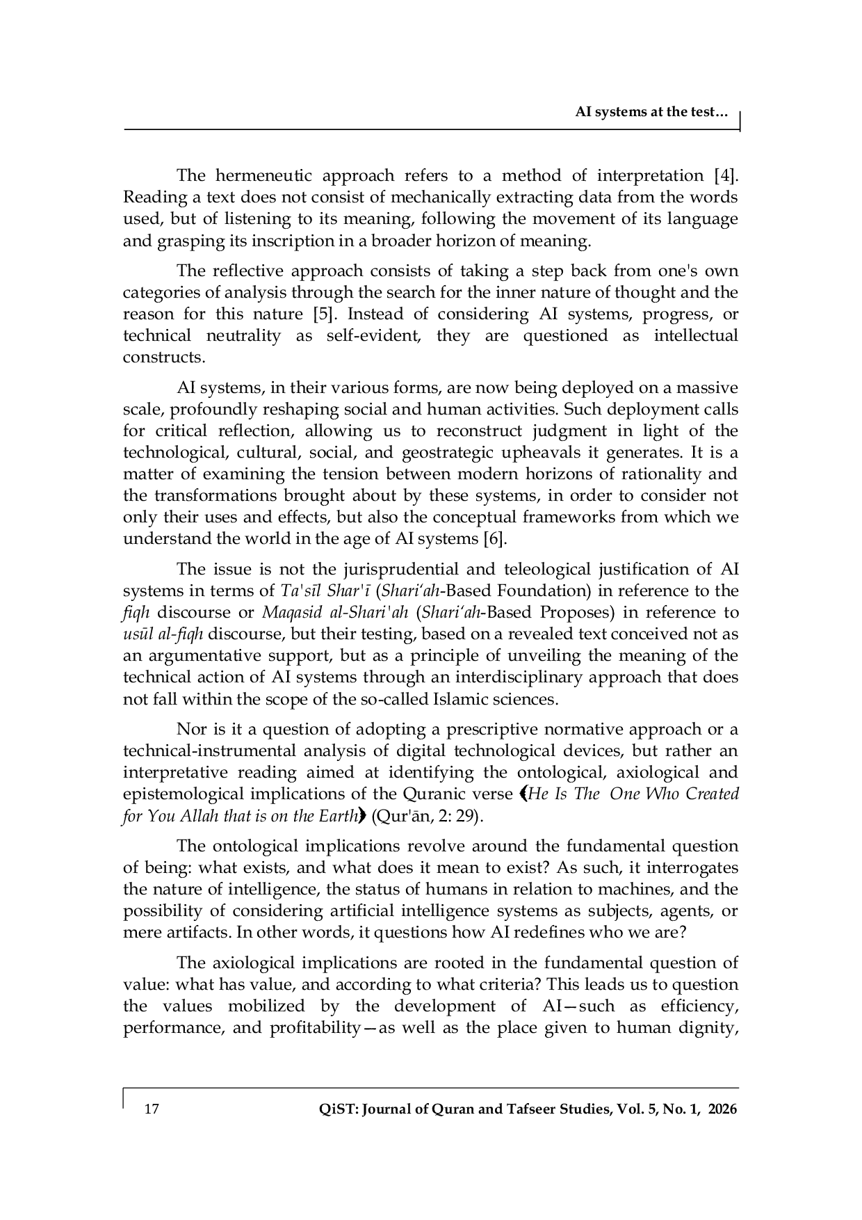QiST: Journal of Quran and Tafseer StudiesQiST: Journal of Quran and Tafseer StudiesThis research offers a reflection on AI systems in light of the Quranic verse, He Is The One Who Created for You Allah that is on the Earth (Qurān, 2: 29). It challenges the traditional view that reduces technology to a mere neutral instrument, revealing instead that it is a profoundly existential, ontological, and ethical human endeavor, demanding responsibility, discernment, and regulation. The study emphasizes that mastering AI systems does not grant humanity absolute sovereignty, but rather places it in the position of mustakhlaf (steward of the earth) and amīn (trustworthy), charged with preserving the balance between creatures and guaranteeing their rights. It warns against the temptation to make AI an end in itself, which could alienate humanity and sever its transcendent connection with the world order through a vertical causality. From this perspective, AI presents itself as a true mirror of human commitment, revealing the depth of our responsibility towards the designs of creation and the realization of the common good, liberated from all pursuit of material domination and any descent into nihilism.