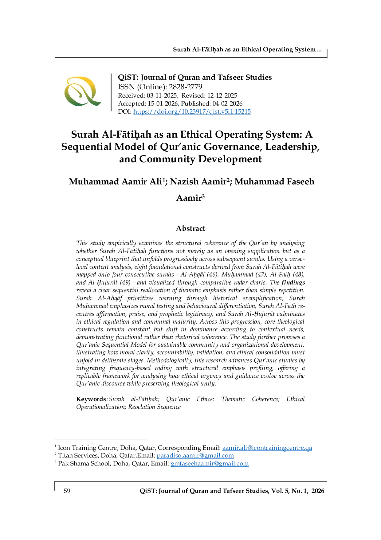 QiST: Journal of Quran and Tafseer StudiesQiST: Journal of Quran and Tafseer StudiesPenelitian ini secara empiris mengkaji koherensi struktural Al-Quran dengan menganalisis apakah Surah Al-Fātiḥah berfungsi tidak hanya sebagai doa pembuka tetapi juga sebagai kerangka konseptual yang berkembang secara progresif melalui surah-surah berikutnya. Dengan menggunakan analisis isi berbasis ayat, delapan konstruk dasar yang berasal dari Surah Al-Fātiḥah dipetakan ke empat surah berturut-turut—Al-Aḥqāf (46), Muḥammad (47), Al-Fatḥ (48), dan Al-Ḥujurāt (49)—serta divisualisasikan melalui diagram radar komparatif. Temuan menunjukkan redistribusi tematik secara berurutan, bukan sekadar pengulangan. Surah Al-Aḥqāf menekankan peringatan melalui contoh historis, Surah Muḥammad menekankan pengujian moral dan diferensiasi perilaku, Surah Al-Fatḥ mengarah ulang pada afirmasi, pujian, dan legitimasi kenabian, serta Surah Al-Ḥujurāt memuncak pada regulasi etis dan kematangan komunal. Dalam perkembangan ini, konstruk teologis inti tetap konstan namun bergeser dominansinya sesuai kebutuhan kontekstual, menunjukkan koherensi fungsional bukan retoris. Penelitian ini juga mengusulkan Model Berurutan Al-Quran untuk pengembangan komunitas dan organisasi yang berkelanjutan, yang mengilustrasikan bagaimana kejelasan moral, akuntabilitas, validasi, dan konsolidasi etis harus berkembang secara bertahap. Secara metodologis, penelitian ini memajukan studi Al-Quran dengan mengintegrasikan koding berbasis frekuensi dan pemetaan profil penekanan struktural, menawarkan kerangka yang dapat direplikasi untuk menganalisis evolusi urgensi dan bimbingan etis dalam wacana Al-Quran sambil mempertahankan kesatuan teologis.