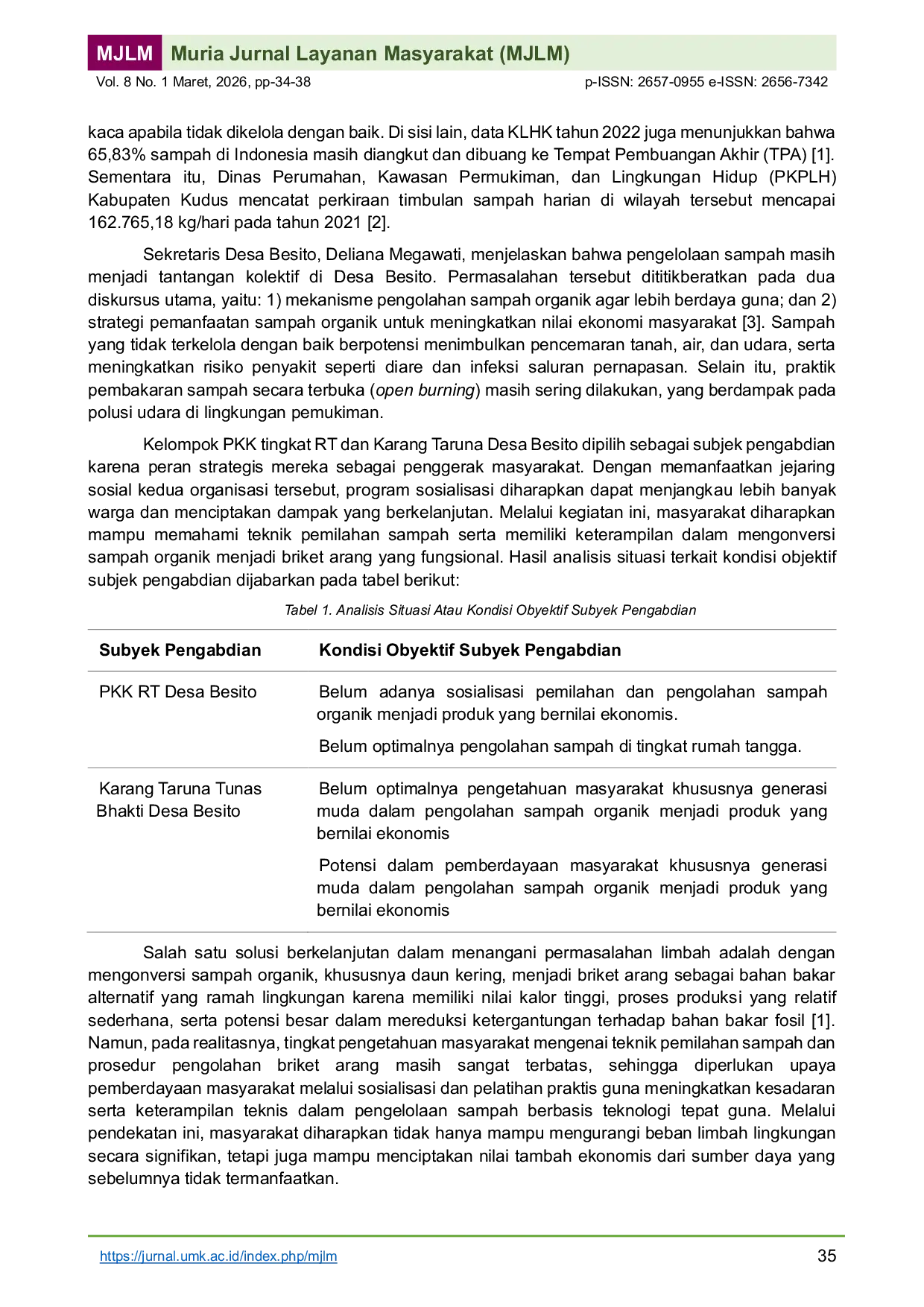 Muria Jurnal Layanan MasyarakatMuria Jurnal Layanan MasyarakatKegiatan sosialisasi pemilahan dan pengolahan sampah organik daun kering menjadi briket arang di Desa Besito bertujuan meningkatkan kesadaran masyarakat dalam pengelolaan sampah berbasis teknologi tepat guna. Metode pelaksanaan meliputi sosialisasi interaktif dan demonstrasi langsung pembuatan briket arang. Peserta terdiri dari Pemerintah Desa Besito, BumDes Desa Besito, masyarakat, anggota PKK RT dan Karang Taruna Desa Besito. Hasil menunjukkan peningkatan pemahaman masyarakat tentang teknik pemilahan sampah, pengolahan briket arang, serta potensi pengurangan volume sampah organik. Luaran mencakup terbentuknya kelompok produksi briket arang mandiri, panduan teknis, dan pemanfaatan produk sebagai energi alternatif ramah lingkungan.