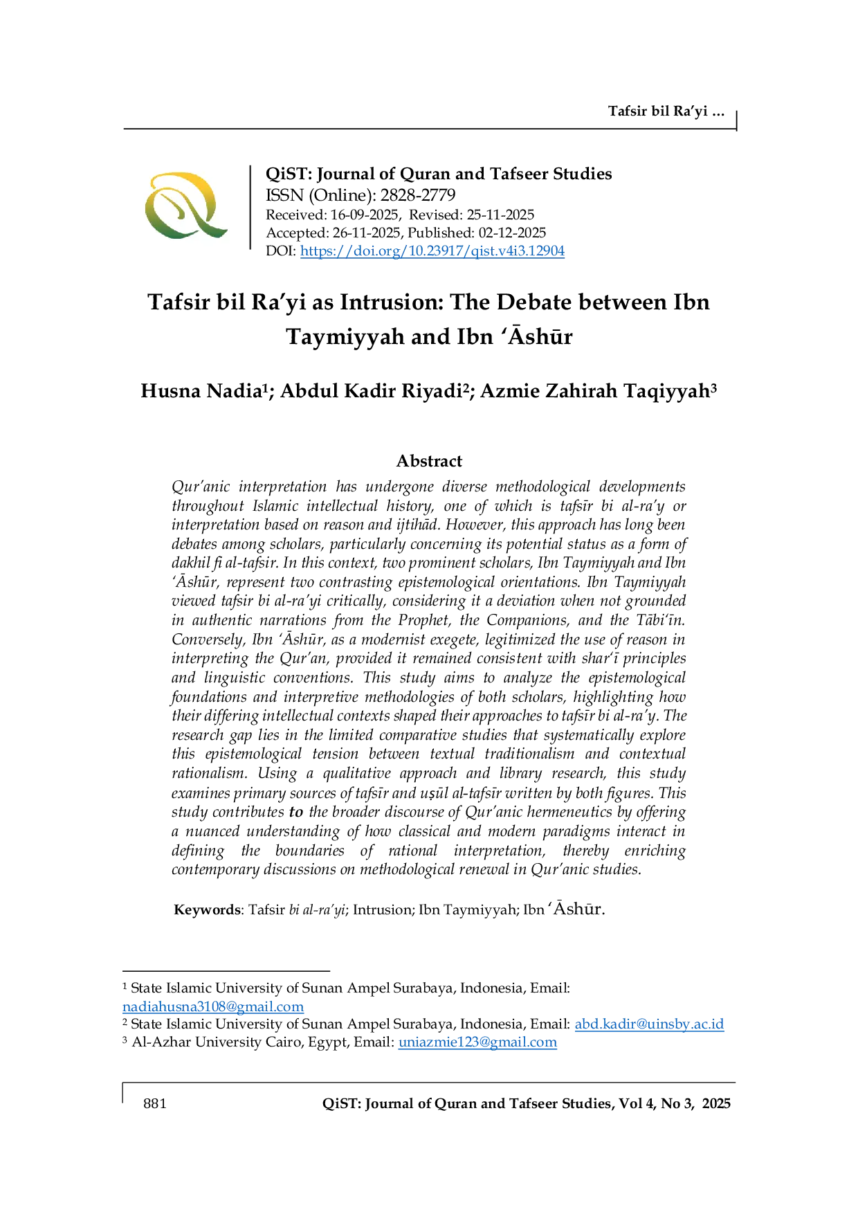 QiST: Journal of Quran and Tafseer StudiesQiST: Journal of Quran and Tafseer StudiesQuranic interpretation has undergone diverse methodological developments throughout Islamic intellectual history, one of which is tafsīr bi al-rayi or interpretation based on reason and ijtihād. However, this approach has long been debated among scholars, particularly concerning its potential status as a form of dakhil fi al-tafsir. In this context, two prominent scholars, Ibn Taymiyyah and Ibn Āshūr, represent two contrasting epistemological orientations. Ibn Taymiyyah viewed tafsir bi al-rayi critically, considering it a deviation when not grounded in authentic narrations from the Prophet, the Companions, and the Tābiīn. Conversely, Ibn Āshūr, as a modernist exegete, legitimized the use of reason in interpreting the Quran, provided it remained consistent with sharī principles and linguistic conventions. This study aims to analyze the epistemological foundations and interpretive methodologies of both scholars, highlighting how their differing intellectual contexts shaped their approaches to tafsīr bi al-rayi. The research gap lies in the limited comparative studies that systematically explore this epistemological tension between textual traditionalism and contextual rationalism. Using a qualitative approach and library research, this study examines primary sources of tafsīr and uṣūl al-tafsīr written by both figures. This study contributes to the broader discourse of Quranic hermeneutics by offering a nuanced understanding of how classical and modern paradigms interact in defining the boundaries of rational interpretation, thereby enriching contemporary discussions on methodological renewal in Quranic studies.