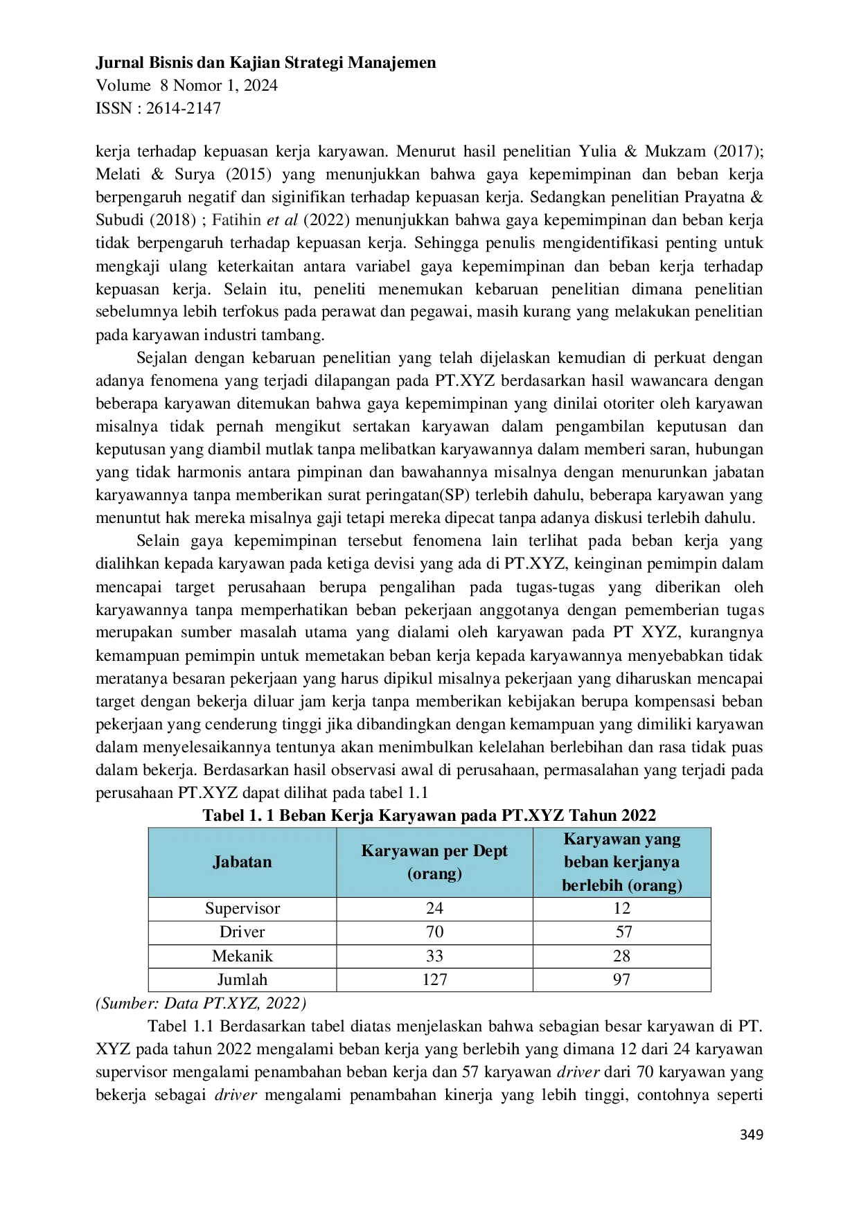 Terdapat pengaruh negatif dan signifikan antara gaya kepemimpinan otoriter terhadap kepuasan kerja karyawan, yang berarti semakin buruk gaya kepemimpinan yang diterapkan, semakin menurun tingkat kepuasan kerja.Terdapat pengaruh negatif dan signifikan antara beban kerja terhadap kepuasan kerja, di mana beban kerja yang tinggi menyebabkan karyawan merasa tidak nyaman dan kurang puas.Kondisi ketidakpuasan karyawan semakin meningkat seiring dengan tingginya beban kerja yang diberikan di luar tanggung jawab mereka.