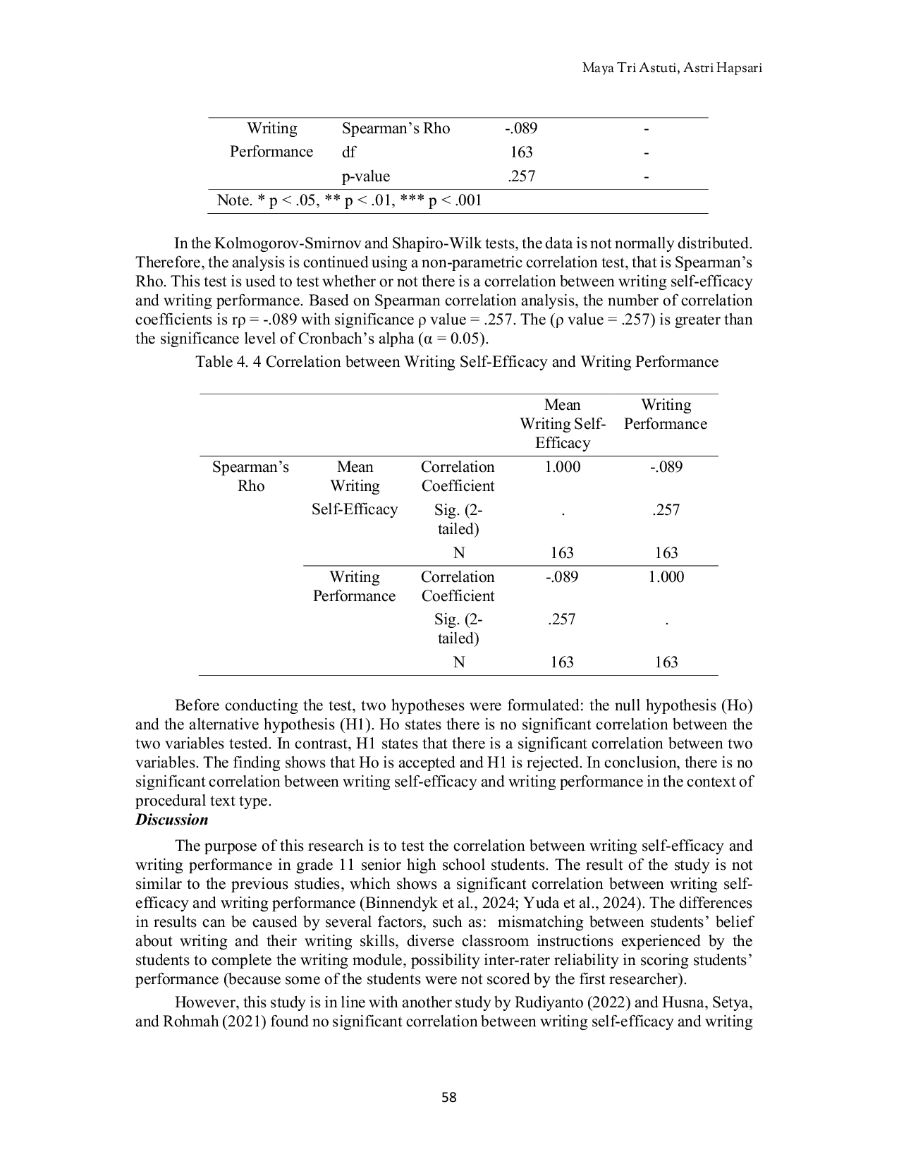 ProminentProminentMeskipun keyakinan diri dalam menulis sangat penting untuk pengembangan keterampilan menulis pembelajar bahasa kedua/asing, masih terdapat keterbatasan penelitian tentang keyakinan diri dalam menulis bahasa Inggris di kalangan siswa sekolah menengah atas di konteks Indonesia. Penelitian ini bertujuan untuk menguji korelasi antara keyakinan diri siswa dalam menulis bahasa Inggris dan performa mereka dalam menulis teks prosedur di sebuah sekolah menengah atas. Sebanyak 163 siswa bersedia berpartisipasi dalam penelitian korelasional ini dengan teknik purposive sampling. Peneliti menggunakan versi bahasa Indonesia dari Second Language Writing Self-Efficacy Scales oleh Teng et al. (2017). Hasil menunjukkan korelasi negatif yang tidak signifikan (r = -0,089) antara keyakinan diri siswa dalam menulis dan performa menulis aktual mereka, dengan nilai signifikansi ρ = 0,257, yang lebih besar dari tingkat signifikansi Cronbachs alpha (α = 0,05). Oleh karena itu, hipotesis nol (H0) diterima, yaitu tidak terdapat korelasi yang signifikan antara keyakinan diri menulis dan performa menulis. Mengingat keterbatasan pada siswa dari satu sekolah kelas XI dan jenis teks prosedur, penelitian lanjutan perlu dilakukan dengan lebih banyak peserta dan variasi jenis teks untuk memperkaya diskusi serta mengeksplorasi faktor-faktor yang lebih berkontribusi terhadap jenis teks tersebut.