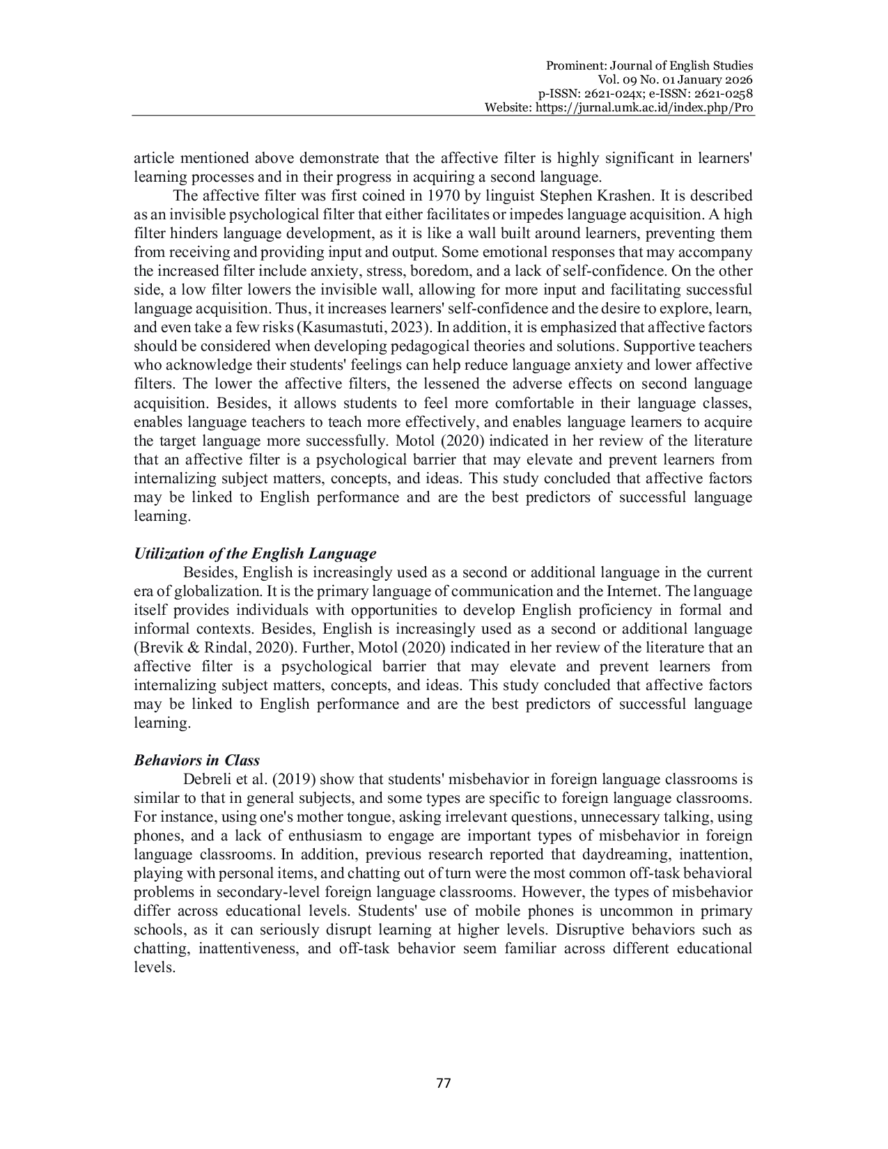 ProminentProminentThis study examined the relationship between students affective filters and English language use in 21st-century classrooms through correlation analysis. Results indicated a significant relationship between affective filter levels and language use patterns, suggesting that emotional and psychological barriers meaningfully impact students willingness and ability to engage with English in classroom settings. The findings carry several implications for language education practice: teachers should develop differentiated, innovative instructional strategies that respond to diverse learning styles and student backgrounds; learner metacognitive awareness of affective factors should be promoted to facilitate more accurate self-assessment and cultivate positive attitudes toward language learning; teachers must demonstrate heightened sensitivity to students affective states and language adaptation processes in increasingly globalized educational contexts, as broader awareness of affective filter variation may help mitigate negative judgments toward learners experiencing elevated anxiety; and these insights can inform the development of enhanced pedagogical materials, teacher training programs, and curricular frameworks that advance both instructional effectiveness and learning outcomes. Based on these findings, the study recommends that teachers actively work to reduce affective barriers by cultivating classroom environments characterized by safety, collaboration, respect, and support, as such learning spaces may increase student comfort levels and promote more confident participation in English language activities, ultimately facilitating more effective language acquisition and use.