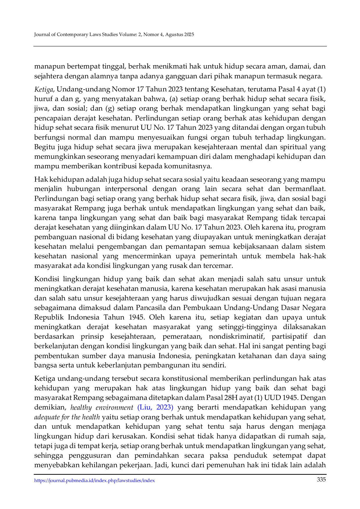 Journal of Contemporary Law StudiesJournal of Contemporary Law StudiesThe right to life includes the entitlement of every individual to a good and healthy environment. It is essential for the state to protect these human rights, including the right to life of the Rempang community. The focus of this writing is to investigate how the right to life of the Rempang residents is safeguarded under existing laws and regulations. The research employs a normative juridical method, aiming to identify and formulate legal arguments through problem analysis. The findings indicate that, constitutionally, the Rempang communitys rights are guaranteed by Article 28H, paragraph (1) of the 1945 Constitution. These rights are further implemented through various laws, including Law Number 32 of 2009 concerning Environmental Protection and Management, Law Number 39 of 1999 concerning Human Rights, and Law Number 17 of 2023 concerning Health. In addition to these national laws, several international conventions also address the right to a healthy environment, which serves as a foundation for states to develop policies that protect human rights within the community. There is also a pressing need for reaffirming law enforcement in regards to human rights, particularly the right to a good and healthy environment, as mandated by existing laws and regulations. The government is expected to act in order to protect, fulfill, and respect human rights, especially the right to a good and healthy environment, at all levels of society.