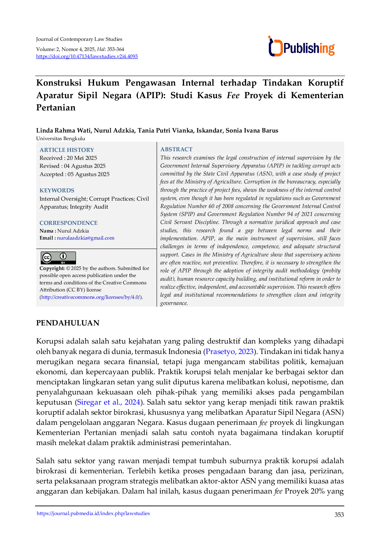 Journal of Contemporary Law StudiesJournal of Contemporary Law StudiesPenelitian ini mengkaji konstruksi hukum pengawasan internal oleh Aparat Pengawasan Intern Pemerintah (APIP) dalam menangani tindakan koruptif yang dilakukan oleh Aparatur Sipil Negara (ASN), dengan studi kasus fee proyek di Kementerian Pertanian. Korupsi dalam birokrasi, khususnya melalui praktik fee proyek, menunjukkan kelemahan sistem pengendalian internal, meskipun telah diatur dalam peraturan seperti Peraturan Pemerintah Nomor 60 Tahun 2008 tentang Sistem Pengendalian Internal Pemerintah (SPIP) dan Peraturan Pemerintah Nomor 94 Tahun 2021 tentang Disiplin Pegawai Negeri Sipil. Melalui pendekatan yuridis normatif dan studi kasus, penelitian ini menemukan adanya kesenjangan antara norma hukum dan implementasinya. APIP, sebagai instrumen utama pengawasan, masih menghadapi tantangan dalam hal independensi, kompetensi, dan dukungan struktural yang memadai. Kasus di Kementerian Pertanian menunjukkan bahwa tindakan pengawasan cenderung reaktif, bukan preventif. Oleh karena itu, perlu penguatan peran APIP melalui penerapan metode audit integritas (probity audit), peningkatan kapasitas sumber daya manusia, serta reformasi kelembagaan agar pengawasan internal menjadi efektif, independen, dan akuntabel. Penelitian ini memberikan rekomendasi hukum dan kelembagaan untuk memperkuat tata kelola pemerintahan yang bersih dan berintegritas.