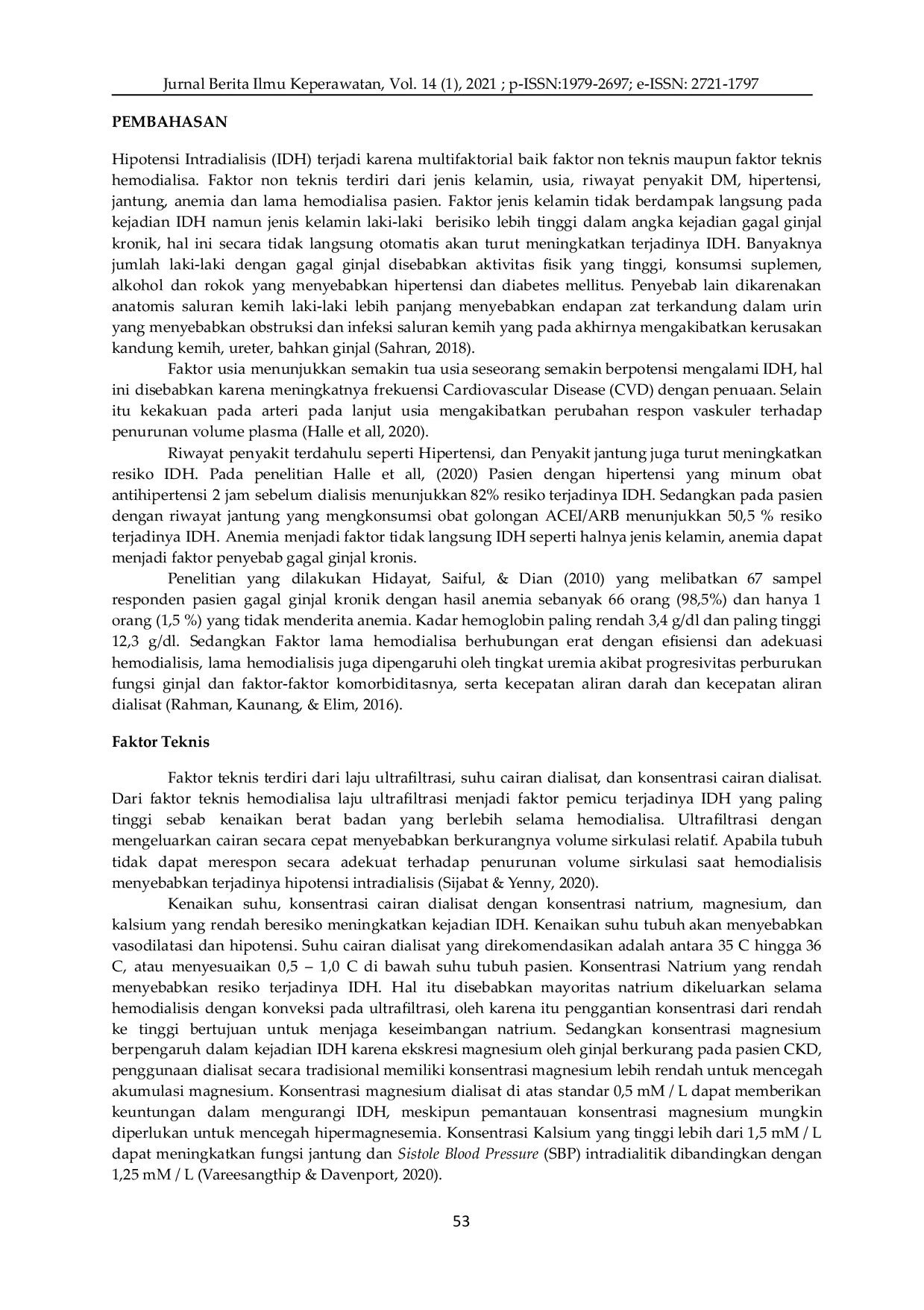 Jurnal Berita Ilmu KeperawatanJurnal Berita Ilmu KeperawatanPenyakit ginjal kronis merupakan gangguan fungsi ginjal yang progresif dan irreversibel dimana tubuh mengalami kegagalan untuk mempertahankan metabolisme, keseimbangan cairan dan elektrolit, sehingga menyebabkan terjadinya uremia. Hemodialisis dilakukan untuk menghilangkan gejala yaitu mengendalikan uremia, kelebihan cairan dan ketidakseimbangan elektrolit yang terjadi pada pasien penyakit ginjal kronik. Selain manfaatnya hemodialisis juga tak jarang memiliki berbagai komplikasi, salah satu komplikasi yang cukup umum terjadi adalah hipotensi Intradialisis (IDH), kasus hipotensi intradialisis mencapai 20 % hingga 30% dalam sesi hemodialisis. Metode yang digunakan adalah penelitian literature review dengan membandingkan beberapa literatur dari penelusuran situs jurnal terakreditasi seperti Sciencedirect, National Center for Biotechnology Information dan Google Scholar dengan kata kunci Hypotension Intradialytic Factor dalam kurun waktu 2015-2020. Hasil Penelitian :. Hipotensi Intradialisis (IDH) terjadi karena multifaktorial baik faktor non teknis maupun faktor teknis hemodialisa. Faktor non teknis terdiri dari jenis kelamin, usia, riwayat hipertensi, jantung, anemia dan lama hemodialisa pasien. Faktor teknis terdiri dari laju ultrafiltrasi, suhu cairan dialisat, dan konsentrasi cairan dialisat. Kesimpulan : Hipotensi Intradialisis terjadi karena diawali dengan faktor-faktor yang multifaktorial, IDH terjadi karena berkurangnya volume sirkulasi darah yang agresif selama sesi hemodialisa.