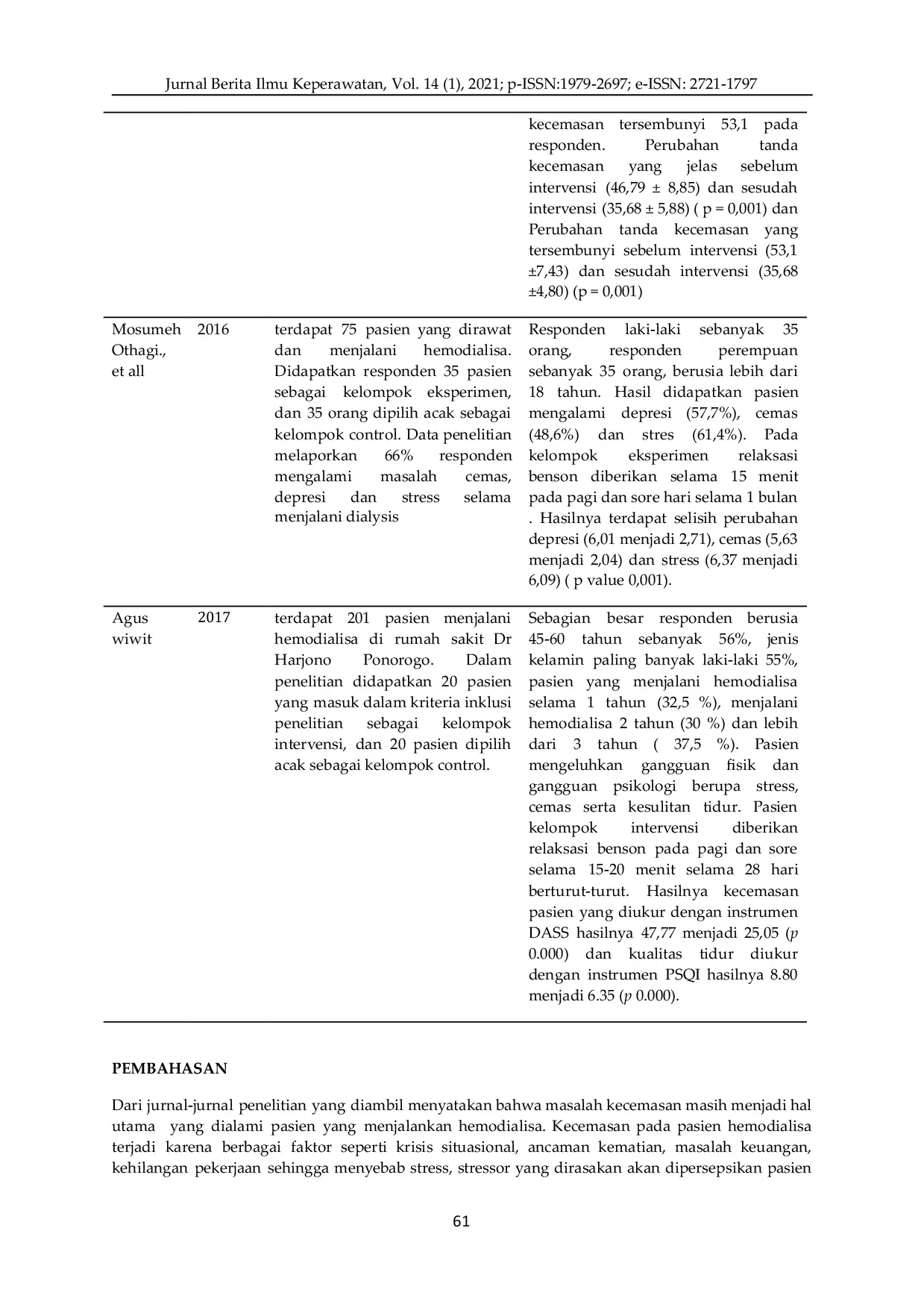 Jurnal Berita Ilmu KeperawatanJurnal Berita Ilmu KeperawatanPendahuluan: Penyakit gagal ginjal merupakan gangguan fungsi ginjal yang terjadi saat tubuh gagal mempertahankan metabolisme, keseimbangan cairan serta elektrolit sehingga dapat menyebabkan terjadinya retensi urea dan sampah nitrogen dalam darah. Hemodialisa menjadi pilihan terapi untuk mengatasi gagal ginjal kronik. Hemodialisa dilakukan dengan alat khusus untuk mempertahankan fungsi ginjal dengan menyeimbangkan kadar elektrolit dan keseimbangan cairan tubuh. Hemodialisa yang dilakukan dalam jangka waktu lama dapat menyebabkan gangguan pada aspek biologis maupun psikologis bagi pasien hemodialisa. Sebanyak 48,6 % pasien hemodialisa mengalami gangguan kecemasan. Salah satu non-farmakologi terapi untuk mengurangi kecemasan yaitu relaksasi benson yang dilakukan selama 15-20 menit setiap pagi dan sore hari. Tujuan dari kajian literatur ini untuk mengetahui efektifitas relaksasi benson terhadap kecemasan pada pasien yang menjalani hemodialisa. Sebuah kajian literatur yaitu membandingkan beberapa literatur melalui penelusuran jurnal dari situs jurnal yang terakreditasi dan kredibel seperti Sciencedirect, PubMed, Elsevier dan Google Scholar dengan menggunakan kata kunci Benson relaxation patient hemodialysis atau “benson technique for anxiety disorders atau “terapi teknik kecemasan non-farmakologi atau “relaxation benson for patient undergoing hemodialysis mulai tahun 2015- 2020 . Ada lima dari delapan jurnal yang dikaji dan digunakan dalam literature review ini. Hasil Penelitian menunjukkan relaksasi benson yang dilakukan sehari 2 kali selama 15-20 menit efektif untuk mengatasi masalah kecemasan pada pasien yang melakukan hemodialisa. Kesimpulan: relaksasi benson efektif dan bekerja dengan baik dalam menurunkan kadar kecemasan pada pasien hemodialisa.