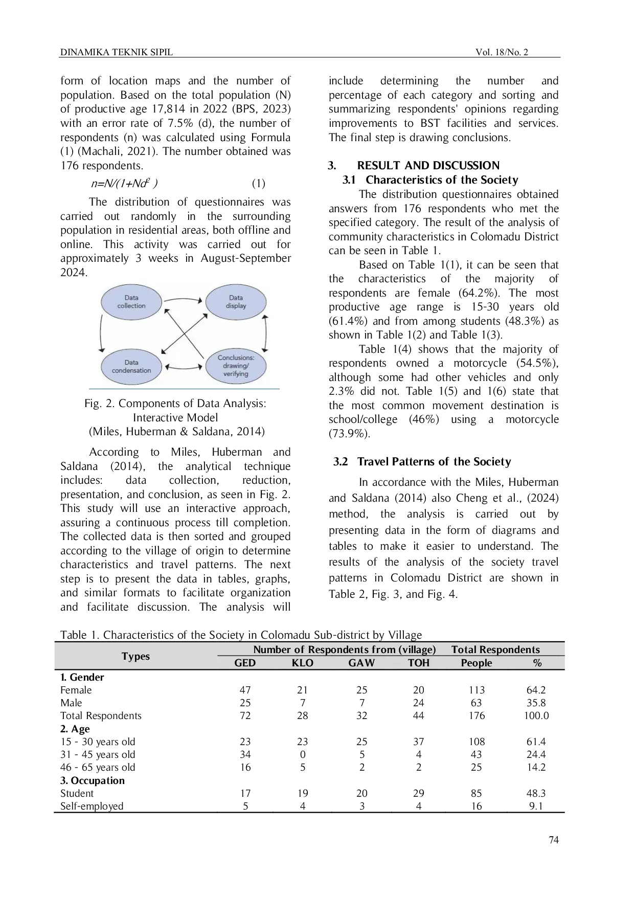 Dinamika Teknik Sipil: Majalah Ilmiah Teknik SipilDinamika Teknik Sipil: Majalah Ilmiah Teknik SipilThe high number of community activities in Colomadu District, Karanganyar, causes traffic congestion at times. This study seeks to examine respondents characteristics and travel patterns in the presence or absence of enhancements to public transportation infrastructure. Primary data includes general information about respondents, their activities, and responses to existing facilities. Data were acquired by distributing Google Form questionnaire URLs both offline and online. The Miles and Huberman Method was employed during the analysis phase. The characteristic analysis revealed that the majority of respondents were female, aged 15-30 years, and from the student/university group. The most commonly owned vehicle was a motorcycle, with the primary reason of travel being school/college. The bulk of travels were school/college-related, with destinations in Surakarta, notably Banjarsari District. Gedongan had the most travel patterns, with 8 activities and 14 destination districts, whereas Tohudan had 7 destination cities/regencies. Gedongan and Gawanan had the most vehicle users, with six different types apiece. Initially, respondents used motorbikes rather than bus stops. With infrastructure upgrades, bus stops grew, while motorbikes declined. This resulted in a reduction in vehicle options from six to five, as well as a new bus stop layout, the majority of which came from Gedongan. Based on these results, it is hoped that improvements in facilities and services will occur in the future, so that there will be an increase in the use of BST.