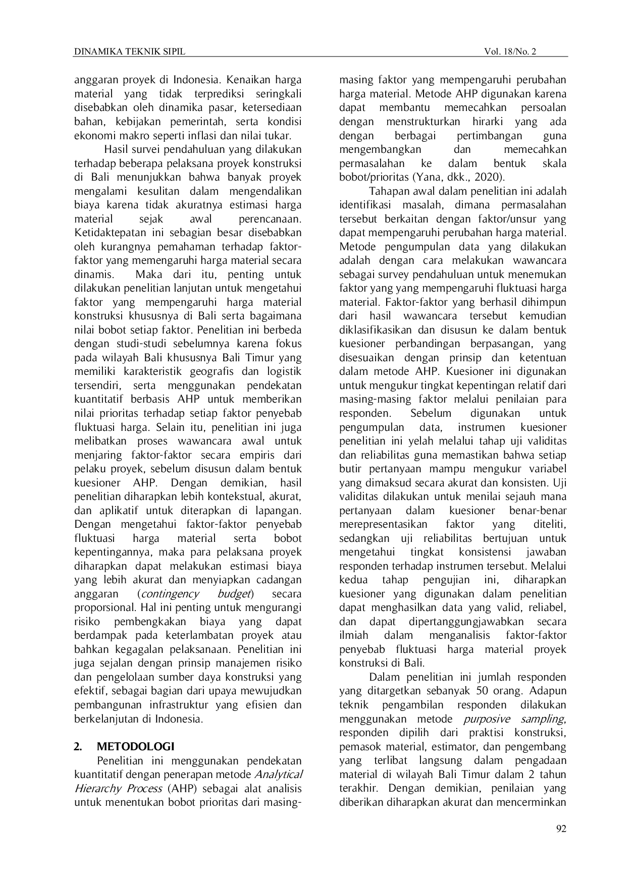 Dinamika Teknik Sipil: Majalah Ilmiah Teknik SipilDinamika Teknik Sipil: Majalah Ilmiah Teknik SipilProyek konstruksi memiliki keterkaitan dengan tujuan pembangunan berkelanjutan (SDGs) melalui penerapan konstruksi berkelanjutan yang menekankan efisiensi sumber daya, termasuk material sebagai komponen biaya terbesar. Material konstruksi menyumbang sekitar 60–80% dari total biaya proyek, sehingga perubahan harga material menjadi faktor krusial yang dapat memicu pembengkakan biaya dan mengganggu keberlanjutan pelaksanaan proyek. Penelitian ini bertujuan untuk mengidentifikasi dan memprioritaskan faktor-faktor yang paling mempengaruhi fluktuasi harga material konstruksi, khususnya pada proyek di wilayah Bali Timur yang memiliki tantangan geografis dan logistik tersendiri. Metode Analytical Hierarchy Process (AHP) digunakan untuk memperoleh bobot prioritas berdasarkan penilaian para praktisi konstruksi. Hasil penelitian menunjukkan bahwa tujuh faktor utama penyebab fluktuasi harga material adalah persediaan material (19,2%), permintaan pasar (15,2%), perubahan harga BBM (15,1%), lokasi proyek (14,7%), kebijakan pemerintah (12,9%), inflasi (12,7%), dan biaya produksi (10,1%). Penelitian ini berkontribusi dalam menyediakan dasar pertimbangan strategis bagi kontraktor dan pemangku kebijakan untuk merumuskan strategi pengendalian biaya dan meningkatkan resiliensi rantai pasok material di Bali Timur.