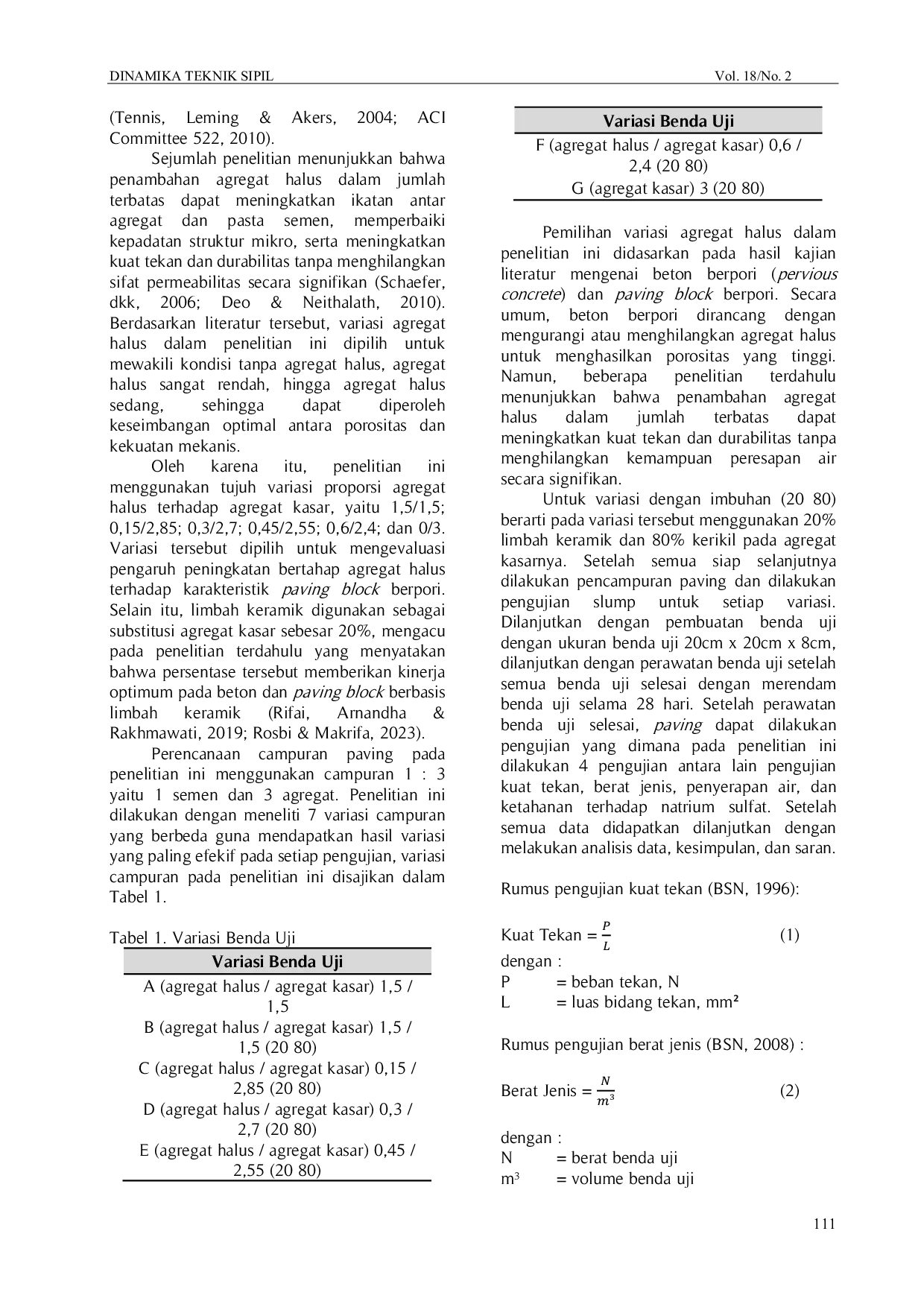 Dinamika Teknik Sipil: Majalah Ilmiah Teknik SipilDinamika Teknik Sipil: Majalah Ilmiah Teknik SipilPengelolaan air hujan merupakan tantangan dalam industri konstruksi karena berpotensi menyebabkan genangan, banjir, dan kerusakan infrastruktur. Salah satu solusi yang dikembangkan adalah paving block berpori, yaitu beton dengan porositas tinggi yang memungkinkan air meresap ke dalam tanah. Penelitian ini bertujuan untuk mengembangkan paving block berpori dengan memanfaatkan limbah keramik sebagai substitusi agregat kasar sebesar 20% serta mengkaji pengaruh variasi proporsi agregat halus terhadap agregat kasar. Parameter yang ditinjau meliputi kuat tekan, penyerapan air, berat jenis, dan ketahanan terhadap natrium sulfat. Metode penelitian meliputi pengujian karakteristik material, pembuatan benda uji dengan perbandingan campuran 1:3 (semen:agregat), serta pengujian laboratorium pada umur 28 hari. Hasil penelitian menunjukkan bahwa variasi 1,5/1,5 dengan substitusi 20% limbah keramik menghasilkan kuat tekan dan ketahanan terhadap natrium sulfat terbaik, sedangkan variasi 0,15/2,85 menghasilkan nilai penyerapan air tertinggi. Pemanfaatan limbah keramik terbukti meningkatkan performa paving block berpori meskipun menyebabkan penurunan berat jenis.