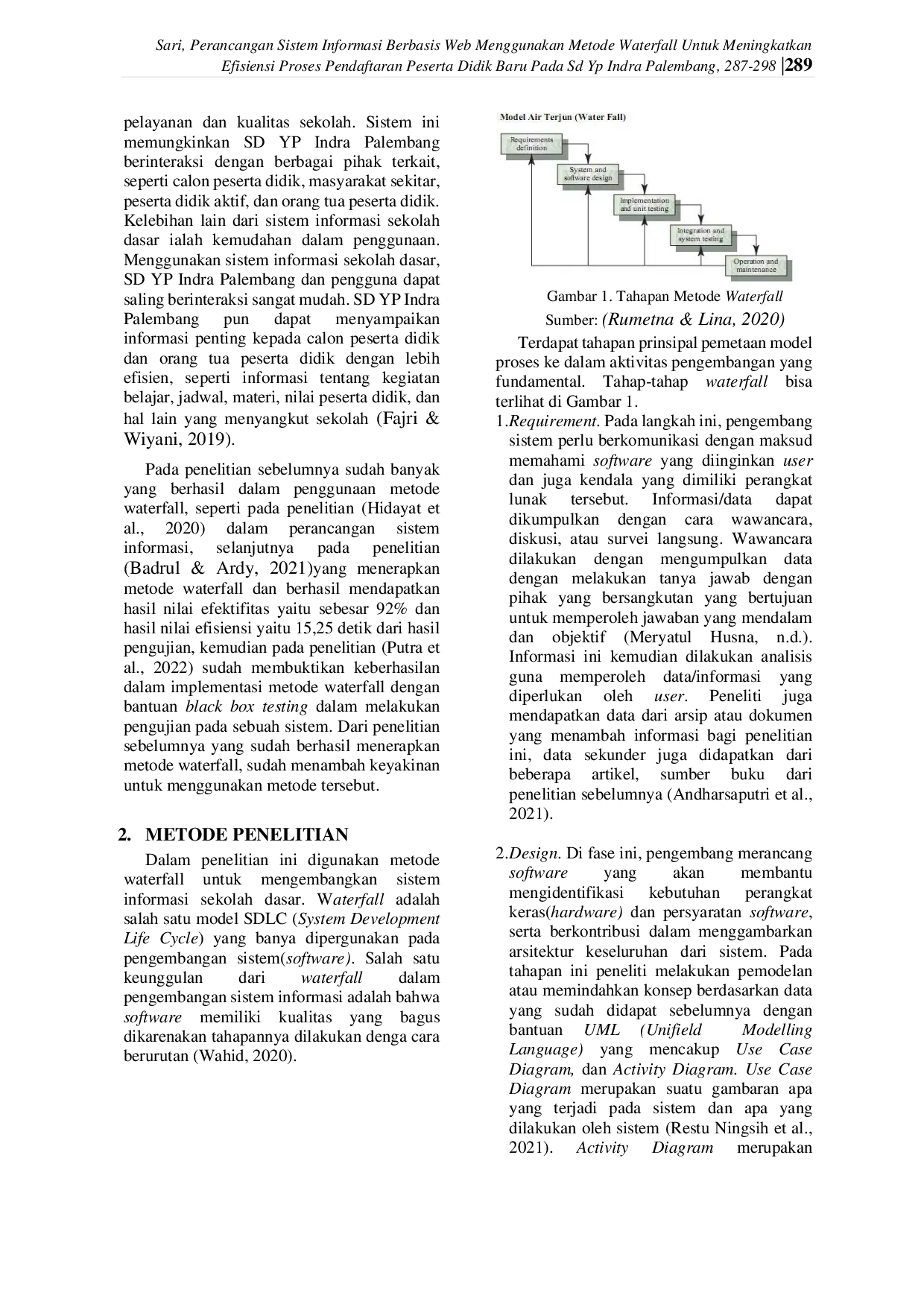 JOISIE (Journal Of Information Systems And Informatics Engineering)JOISIE (Journal Of Information Systems And Informatics Engineering)Penerimaan calon peserta didik baru merupakan kegiatan sekolah yang rutin dilakukan sekali dalam satu tahun bahkan pada pertengahan tahun mengajar. Pengolahan data calon peserta didik baru di Sekolah Dasar YP Indra Palembang yang terletak di Kecamatan Plaju, Kota Palembang masih dilakukan dengan cara yang konvensional yakni orang tua murid harus datang langsung ke sekolah untuk melakukan pendaftaran anaknya dan mengisi bermacam formulir untuk melengkapi data, dan selama ini masih dilakukan dengan cara manual yang mungkin menimbulkan terjadi kesalahan. Penyebaran informasi di Sekolah Dasar YP Indra Palembang juga hanya melalui poster atau spanduk di sekolah. Hal ini menyebabkan orang tua murid kesulitan mendapatkan informasi yang diperlukan untuk melakukan pendaftaran dan hal ini juga membuat pihak sekolah menghadapi masalah dengan formulir yang tidak dapat disortir dengan cepat dan dilakukan dengan cara manual. Melihat permasalahan tersebut, maka solusi yang bisa diusulkan adalah sebuah sistem informasi sekolah dasar berbasis web yang dapat menolong penginputan data siswa calon baru dapat dilakukan dengan lebih praktis, penyaringan data pendaftar dapat dilakukan secara efisien, dan pencarian serta penyajian informasi dapat dilakukan dengan lebih cepat. Pada penelitian ini metode yang digunakan ialah metode waterfall, yang mana merupakan salah satu metode pengembangan dimana pelaksanaannya dilakukan dengan cara yang bertahap sehingga meminimalisir kesalahan yang mungkin terjadi. Hasil akhir dari perancangan sistem informasi ini adalah sebuah sistem yang dapat membantu dan memberikan kemudahan dalam proses penerimaan atau pendaftaran siswa baru sehingga proses tersebut dapat menjadi lebih efisien dan efektif. Dengan adanya sistem ini, pihak sekolah dapat dengan mudah mengelola data siswa, menyederhanakan proses seleksi, dan memberikan informasi yang lebih cepat kepada calon siswa dan orang tua.