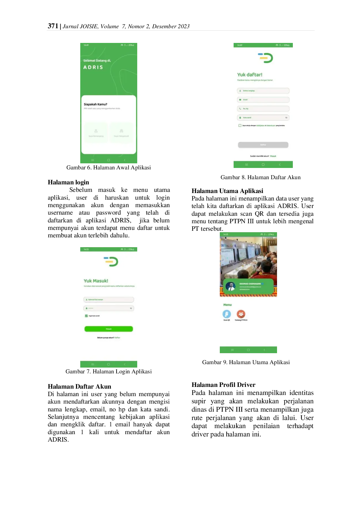 JOISIE (Journal Of Information Systems And Informatics Engineering)JOISIE (Journal Of Information Systems And Informatics Engineering)Penelitian ini mengatasi kendala dalam penilaian kinerja driver secara manual di PT Perkebunan Nusantara III. Sistem manual memakan waktu dan rentan terhadap penilaian subjektif. Untuk meningkatkan efisiensi, perusahaan memutuskan beralih ke solusi mobile dengan memanfaatkan platform Kodular. Aplikasi yang dihasilkan, ADRIS (Agro Driver Resource Information System), dirancang untuk menilai kinerja supir dengan kemudahan akses dan fleksibilitas. Tujuan penelitian ini adalah merancang, mengimplementasi, menguji, dan mengevaluasi ADRIS agar efektif dan efisien. Metode penelitian menggunakan observasi, wawancara, dan studi pustaka untuk mengidentifikasi kebutuhan sistem. Pengembangan sistem mengadopsi metode air terjun (waterfall) dengan tahapan implementasi, pengujian, dan pemeliharaan. Aplikasi ADRIS memungkinkan pengemudi melakukan registrasi, login, menampilkan dashboard, melakukan perjalanan, dan memberikan penilaian. Uji coba blackbox melibatkan pengujian fungsionalitas seperti registrasi, login, dan penilaian, yang semuanya berjalan sesuai harapan. Hasil penelitian menunjukkan bahwa ADRIS dapat memberikan solusi efektif dengan kemudahan penggunaan. Tujuan penelitian ini yaitu mengimplementasikan aplikasi ADRIS memungkinkan evaluasi kinerja driver secara real-time dan berkala, membantu perusahaan melacak tren kinerja, mengidentifikasi perbaikan, dan mendukung pengambilan keputusan manajemen. Dengan demikian, implementasi ADRIS diharapkan dapat meningkatkan efisiensi operasional dan akurasi penilaian kinerja driver di PT Perkebunan Nusantara III.