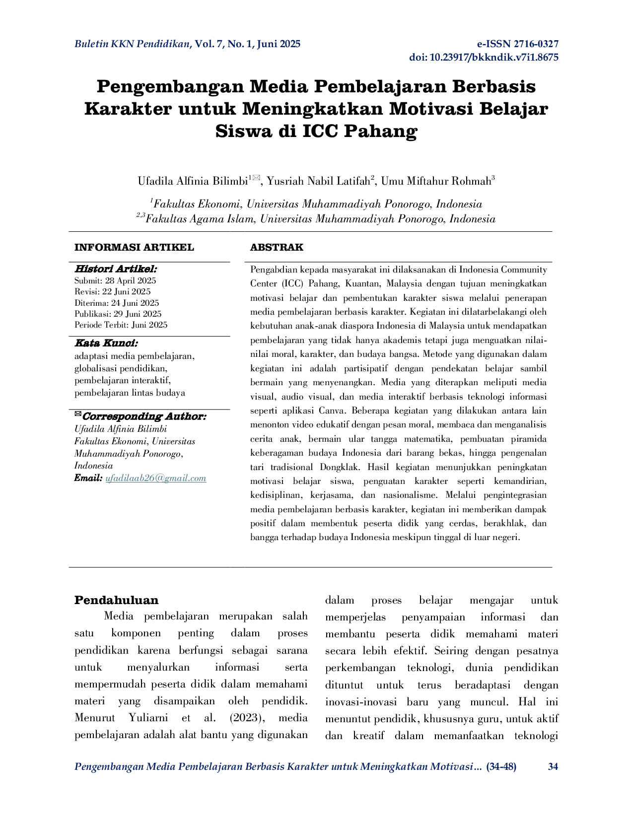Buletin KKN PendidikanBuletin KKN PendidikanPengabdian kepada masyarakat ini dilaksanakan di Indonesia Community Center (ICC) Pahang, Kuantan, Malaysia dengan tujuan meningkatkan motivasi belajar dan pembentukan karakter siswa melalui penerapan media pembelajaran berbasis karakter. Kegiatan ini dilatarbelakangi oleh kebutuhan anak-anak diaspora Indonesia di Malaysia untuk mendapatkan pembelajaran yang tidak hanya akademis tetapi juga menguatkan nilai-nilai moral, karakter, dan budaya bangsa. Metode yang digunakan dalam kegiatan ini adalah partisipatif dengan pendekatan belajar sambil bermain yang menyenangkan. Media yang diterapkan meliputi media visual, audio visual, dan media interaktif berbasis teknologi informasi seperti aplikasi Canva. Beberapa kegiatan yang dilakukan antara lain menonton video edukatif dengan pesan moral, membaca dan menganalisis cerita anak, bermain ular tangga matematika, pembuatan piramida keberagaman budaya Indonesia dari barang bekas, hingga pengenalan tari tradisional Dongklak. Hasil kegiatan menunjukkan peningkatan motivasi belajar siswa, penguatan karakter seperti kemandirian, kedisiplinan, kerjasama, dan nasionalisme. Melalui pengintegrasian media pembelajaran berbasis karakter, kegiatan ini memberikan dampak positif dalam membentuk peserta didik yang cerdas, berakhlak, dan bangga terhadap budaya Indonesia meskipun tinggal di luar negeri.