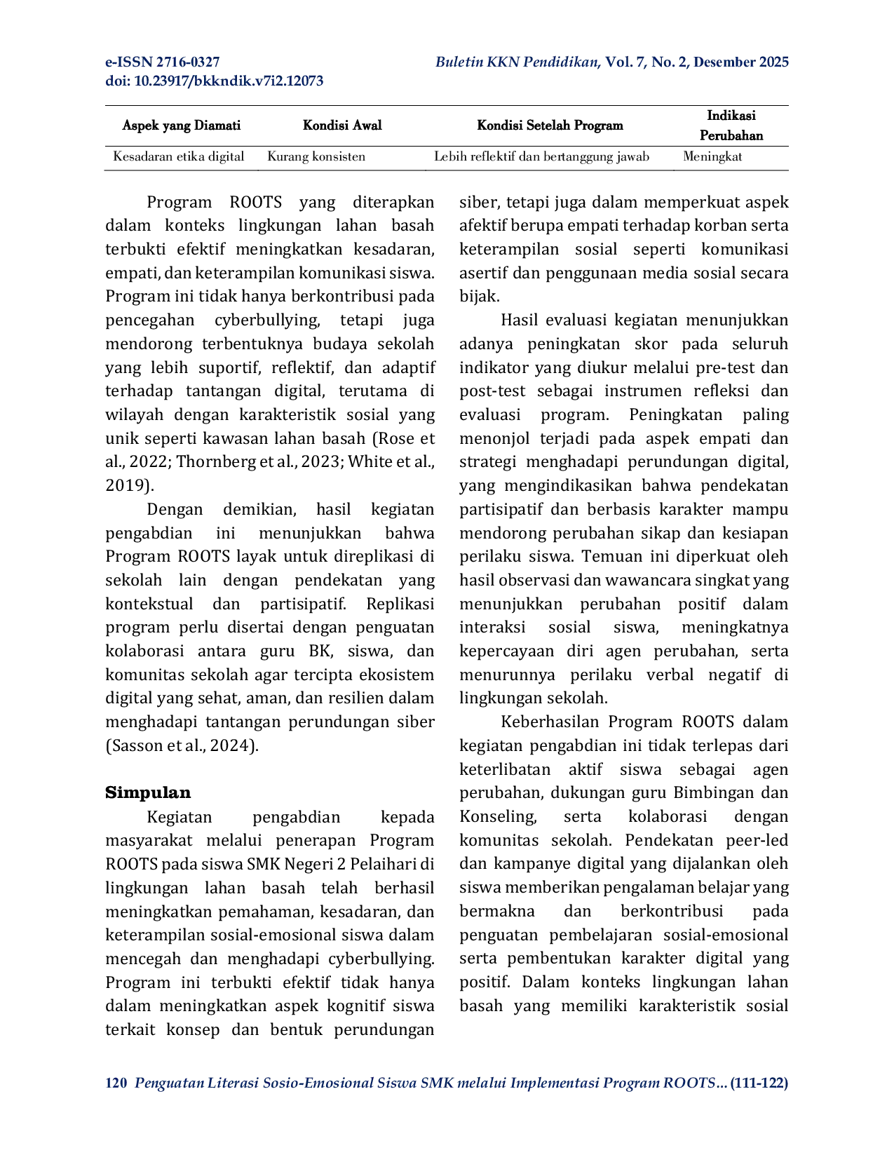 Buletin KKN PendidikanBuletin KKN PendidikanCyberbullying merupakan salah satu permasalahan serius dalam ekosistem pendidikan modern yang berdampak pada kesehatan mental, interaksi sosial, dan iklim belajar siswa, khususnya di kalangan remaja pengguna aktif media sosial. Permasalahan ini menjadi semakin kompleks di lingkungan sekolah kawasan lahan basah, di mana peningkatan penggunaan teknologi digital belum sepenuhnya diimbangi dengan literasi digital dan penguatan karakter sosial-emosional siswa. Kegiatan pengabdian kepada masyarakat ini bertujuan untuk meningkatkan pemahaman, empati, serta keterampilan sosial siswa SMK Negeri 2 Pelaihari dalam mencegah dan menghadapi cyberbullying melalui penerapan Program ROOTS (Respect, Observance, Outreach, Togetherness, and Support) berbasis partisipatif. Metode pelaksanaan meliputi pendidikan masyarakat melalui sosialisasi dan penyuluhan, pelatihan penguatan karakter dan komunikasi asertif berbasis Program ROOTS, produksi konten kampanye digital anti-cyberbullying oleh siswa agen perubahan, serta pendampingan dan advokasi berkelanjutan bersama pihak sekolah. Evaluasi kegiatan dilakukan menggunakan instrumen pre-test dan post-test sebagai alat refleksi untuk mengukur peningkatan pemahaman siswa, didukung oleh observasi dan dokumentasi kegiatan. Hasil pengabdian menunjukkan adanya peningkatan pada seluruh indikator, baik aspek kognitif, afektif, maupun keterampilan sosial, dengan peningkatan paling signifikan pada empati terhadap korban dan strategi menghadapi perundungan digital. Selain itu, terjadi perubahan perilaku sosial yang positif, meningkatnya kepercayaan diri siswa sebagai agen perubahan, serta terbentuknya budaya sekolah yang lebih suportif dan responsif terhadap isu cyberbullying. Kegiatan ini menunjukkan bahwa Program ROOTS efektif sebagai model intervensi preventif berbasis pengabdian kepada masyarakat dan layak direplikasi di sekolah lain dengan pendekatan kontekstual dan kolaboratif.