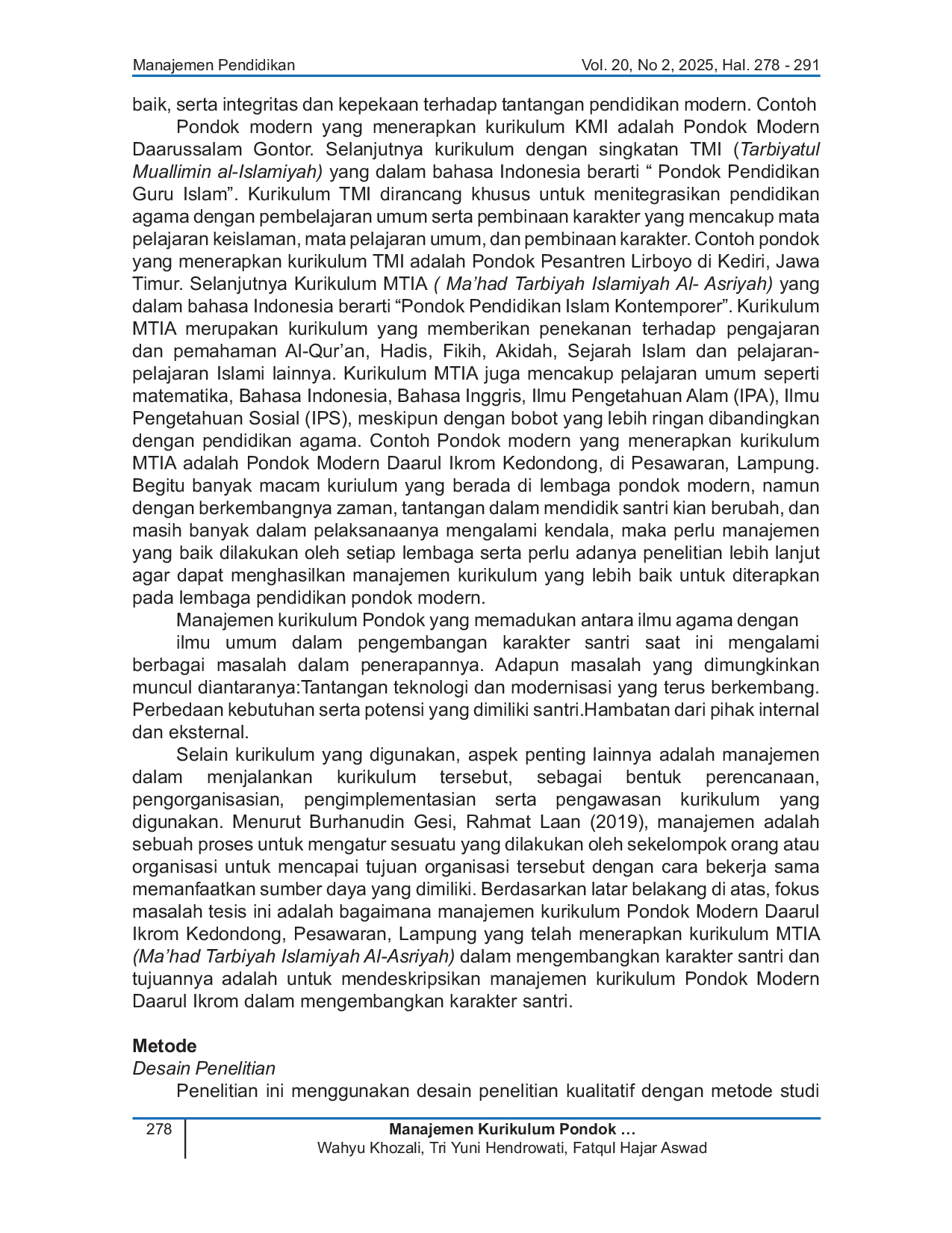 Manajemen PendidikanManajemen PendidikanPenelitian ini mengkaji pengelolaan kurikulum di Pondok Modern Daarul Ikrom dalam mengembangkan karakter santri, dengan fokus pada kurikulum MTIA (Mahad Tarbiyah Islamiyah Al-Asriyah) yang mengintegrasikan pendidikan Islam dan umum. Isu latar belakang antara lain tantangan dalam memodernisasi pendidikan pesantren dengan tetap menjaga nilai-nilai Islam, dengan tujuan untuk mendeskripsikan bagaimana pengelolaan kurikulum menumbuhkan karakter santri melalui perencanaan, pengorganisasian, implementasi, dan evaluasi. Metode studi kasus kualitatif digunakan di Pondok Modern Daarul Ikrom, Pesawaran, Lampung, menggunakan wawancara, observasi, dan analisis dokumen, dianalisis melalui model Miles dan Huberman. Hasil penelitian menunjukkan bahwa pengelolaan kurikulum menekankan integrasi akademik-non-akademik, kebiasaan positif seperti doa dan kebersihan, serta peran pemimpin dalam memastikan disiplin, tanggung jawab, dan kepemimpinan. Kesimpulan menyoroti pengembangan karakter yang efektif dengan implikasi positif bagi integritas santri, meskipun kolaborasi eksternal disarankan untuk inovasi.