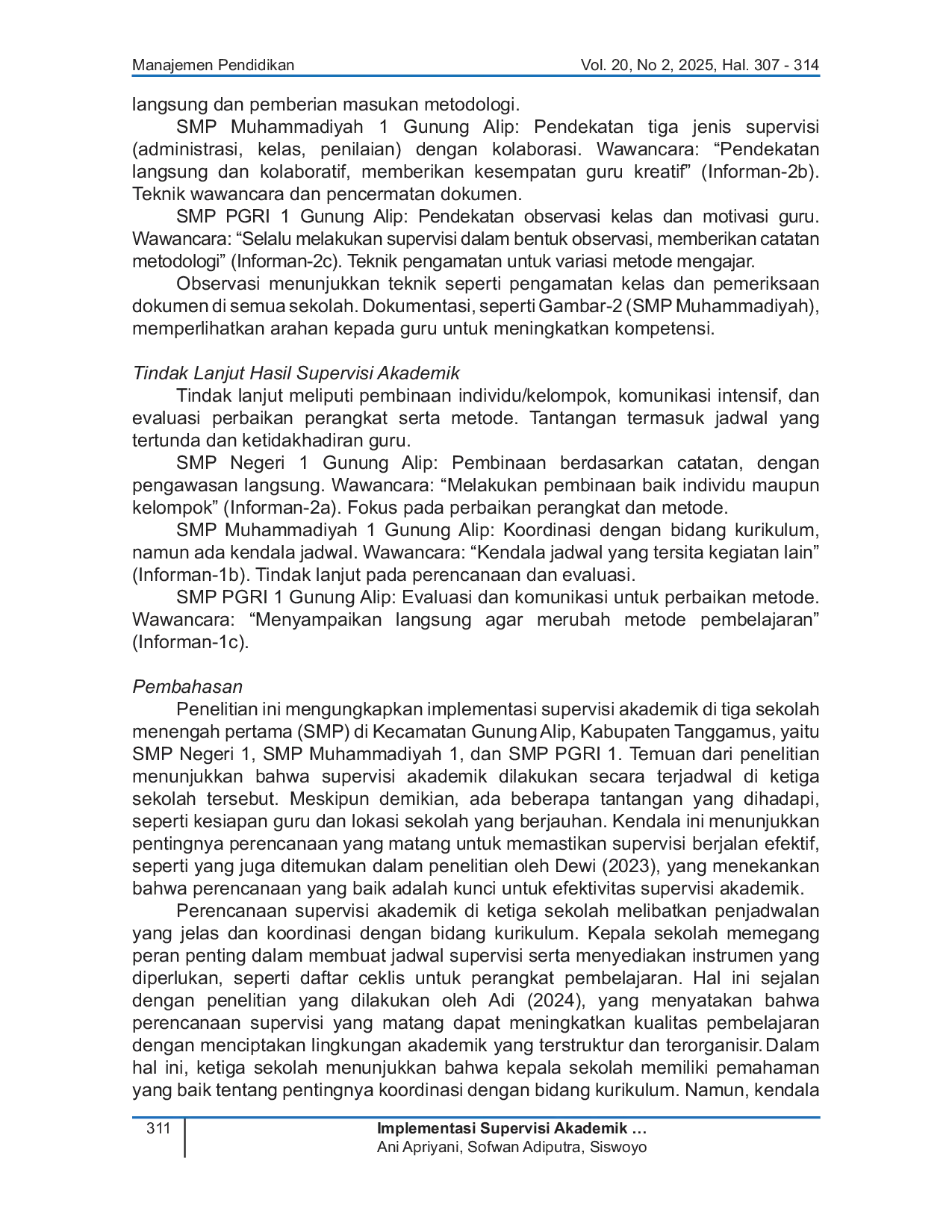 Manajemen PendidikanManajemen PendidikanPenelitian ini bertujuan untuk mengungkap implementasi supervisi akademik di tiga sekolah menengah pertama (SMP) di Kecamatan Gunung Alip, Kabupaten Tanggamus, yaitu SMP Negeri 1, SMP Muhammadiyah 1, dan SMP PGRI 1. Berdasarkan wawancara dengan kepala sekolah, guru, dan bidang kurikulum, serta observasi langsung dan dokumentasi, ditemukan bahwa supervisi akademik dilakukan secara terjadwal, meskipun masih ada tantangan seperti kesiapan guru dan lokasi sekolah yang berjauhan. Perencanaan supervisi melibatkan koordinasi dengan bidang kurikulum dan penyediaan instrumen untuk perangkat pembelajaran. Pendekatan yang digunakan dalam supervisi meliputi observasi langsung, pemeriksaan dokumen, dan kolaborasi dengan guru. Tindak lanjut supervisi dilakukan dengan pembinaan individu dan kelompok, serta evaluasi perbaikan perangkat dan metode mengajar. Kendala seperti keterbatasan waktu dan ketidakhadiran guru menjadi tantangan utama yang harus diatasi. Penelitian ini memberikan rekomendasi untuk perbaikan sistem jadwal, peningkatan kompetensi guru, dan penguatan kolaborasi antara kepala sekolah, guru, dan bidang kurikulum.