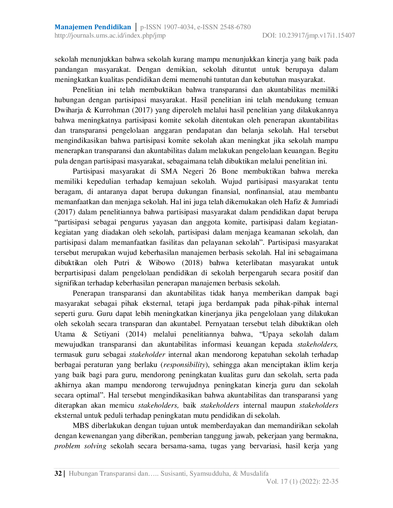 Manajemen PendidikanManajemen PendidikanArtikel ini bertujuan untuk menganalisis dan menguji hubungan antara transparansi, akuntabilitas, dan partisipasi masyarakat. Penelitian ini dilakukan di SMA Negeri 26 Bone menggunakan pendekatan kuantitatif melalui studi korelasional. Responden dalam penelitian ini berjumlah 87 orang, terdiri dari 28 guru yang diambil secara keseluruhan, 53 orang tua siswa, dan 6 anggota komite sekolah. Teknik pengumpulan data yang digunakan adalah dengan menyebarkan kuesioner kepada responden penelitian. Data yang diperoleh melalui kuesioner kemudian dianalisis menggunakan analisis korelasi product moment dan korelasi ganda. Hasil penelitian ini telah membuktikan bahwa: 1) terdapat hubungan positif dan signifikan antara transparansi dengan partisipasi masyarakat; dan 2) terdapat hubungan positif dan signifikan antara akuntabilitas dengan partisipasi masyarakat. Dengan demikian, penerapan transparansi dalam manajemen pendidikan akan mendorong kesadaran masyarakat untuk berpartisipasi dalam membantu meningkatkan kualitas pendidikan di sekolah.
