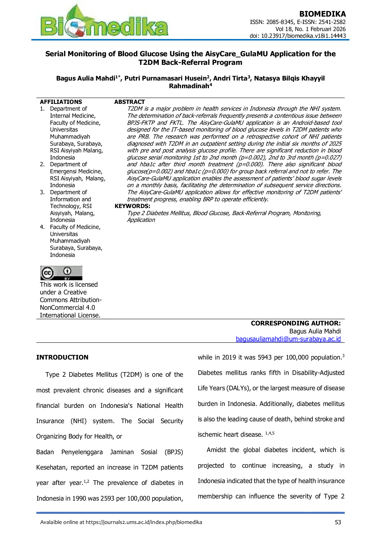 BiomedikaBiomedikaT2DM is a major problem in health services in Indonesia through the NHI system. The determination of back-referrals frequently presents a contentious issue between BPJS-FKTP and FKTL. The AisyCare-GulaMU application is an Android-based tool designed for the IT-based monitoring of blood glucose levels in T2DM patients who are PRB. The research was performed on a retrospective cohort of NHI patients diagnosed with T2DM in an outpatient setting during the initial six months of 2025 with pre and post analysis glucose profile. There are significant reduction in blood glucose serial monitoring 1st to 2nd month (p=0.002), 2nd to 3rd month (p=0.027) and hba1c after third month treatment (p=0.000). There also significant blood glucose(p=0.002) and hba1c (p=0.000) for group back referral and not to refer. The AisyCare-GulaMU application enables the assessment of patients blood sugar levels on a monthly basis, facilitating the determination of subsequent service directions. The AisyCare-GulaMU application allows for effective monitoring of T2DM patients treatment progress, enabling BRP to operate efficiently.