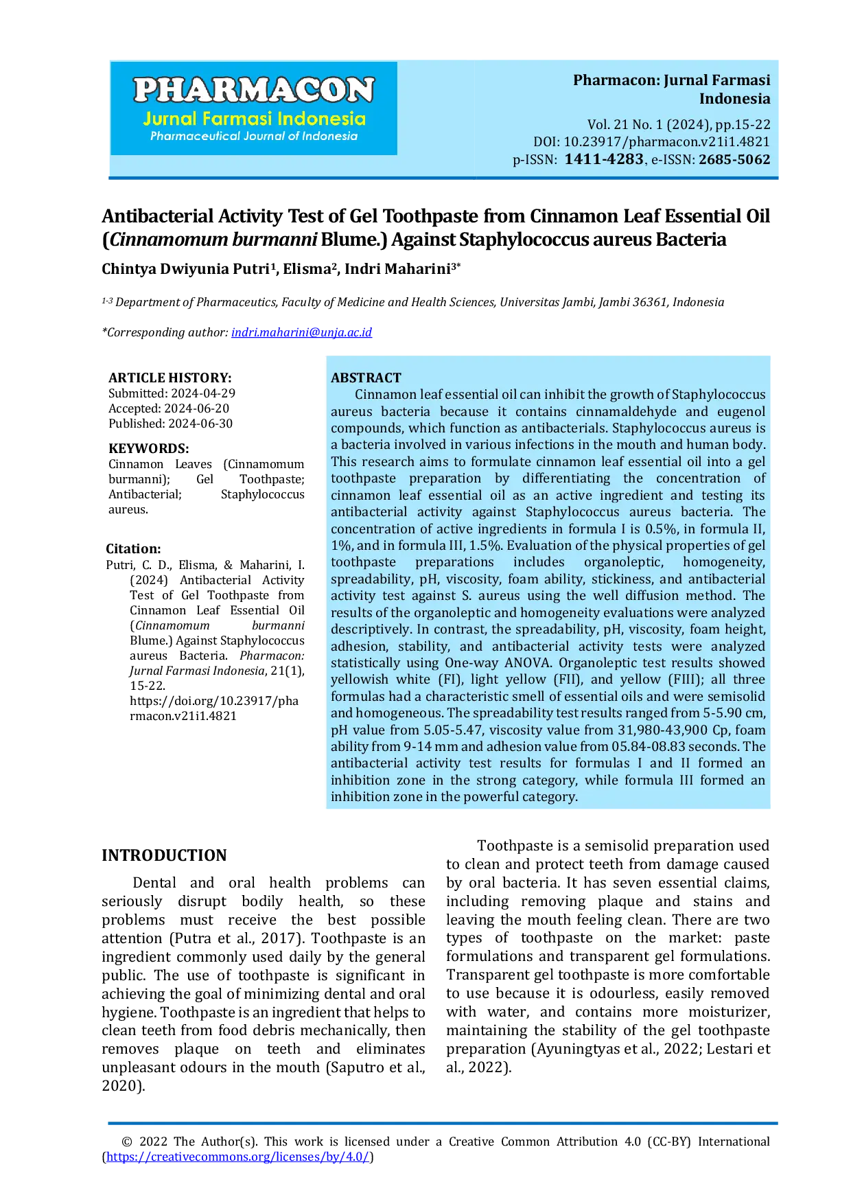 Pharmacon: Jurnal Farmasi IndonesiaPharmacon: Jurnal Farmasi IndonesiaMinyak atsiri daun kayu manis dapat menghambat pertumbuhan bakteri Staphylococcus aureus karena mengandung senyawa cinnamaldehid dan eugenol, yang berfungsi sebagai antibakteri. Staphylococcus aureus adalah bakteri yang terlibat dalam berbagai infeksi di mulut dan tubuh manusia. Penelitian ini bertujuan untuk merumuskan minyak atsiri daun kayu manis menjadi sediaan gel pasta gigi dengan membedakan konsentrasi minyak atsiri daun kayu manis sebagai bahan aktif dan menguji aktivitas antibakterinya terhadap bakteri Staphylococcus aureus. Konsentrasi bahan aktif pada formula I adalah 0,5%, pada formula II, 1%, dan pada formula III, 1,5%. Evaluasi sifat fisik gel pasta gigi meliputi homogenitas, daya sebar, pH, viskositas, kemampuan berbusa, kelengketan, dan uji aktivitas antibakteri terhadap S. aureus menggunakan metode difusi sumur. Hasil evaluasi organoleptik menunjukkan kekuningan putih (FI), kuning muda (FII), dan kuning (FIII); ketiga formula memiliki bau esensial oil yang khas dan bersifat semi padat dan homogen. Hasil uji daya sebar berkisar antara 5-5,90 cm, nilai pH dari 5,05-5,47, nilai viskositas dari 31.980-43.900 Cp, tinggi busa dari 9-14 mm dan nilai kelengketan dari 05,84-08,83 detik. Hasil uji aktivitas antibakteri untuk formula I dan II membentuk zona hambat dalam kategori kuat, sedangkan formula III membentuk zona hambat dalam kategori kuat.