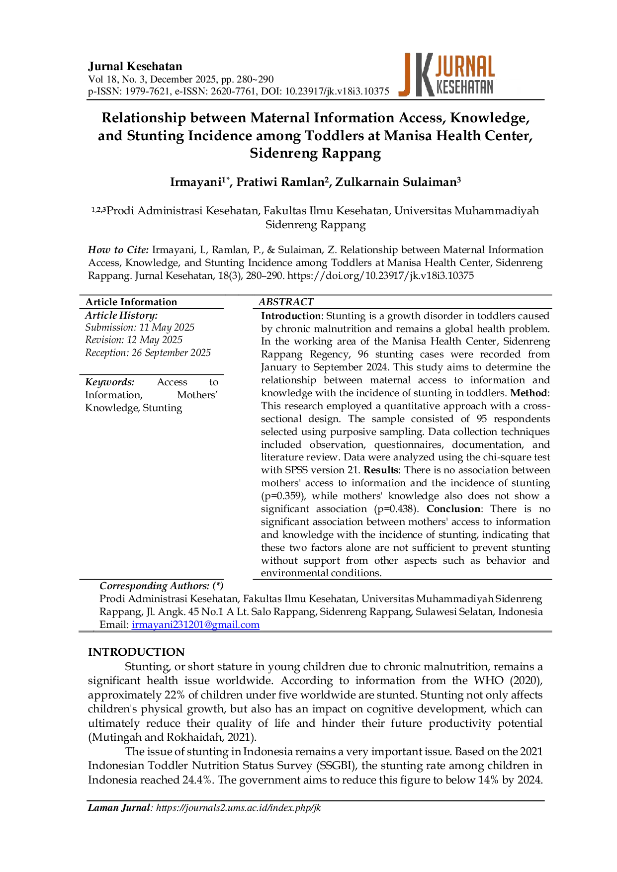 Jurnal KesehatanJurnal KesehatanIntroduction: Stunting is a growth disorder in toddlers caused by chronic malnutrition and remains a global health problem. In the working area of the Manisa Health Center, Sidenreng Rappang Regency, 96 stunting cases were recorded from January to September 2024. This study aims to determine the relationship between maternal access to information and knowledge with the incidence of stunting in toddlers. Method: This research employed a quantitative approach with a cross-sectional design. The sample consisted of 95 respondents selected using purposive sampling. Data collection techniques included observation, questionnaires, documentation, and literature review. Data were analyzed using the chi-square test with SPSS version 21. Results: There is no association between mothers access to information and the incidence of stunting (p=0.359), while mothers knowledge also does not show a significant association (p=0.438). Conclusion: There is no significant association between mothers access to information and knowledge with the incidence of stunting, indicating that these two factors alone are not sufficient to prevent stunting without support from other aspects such as behavior and environmental conditions.