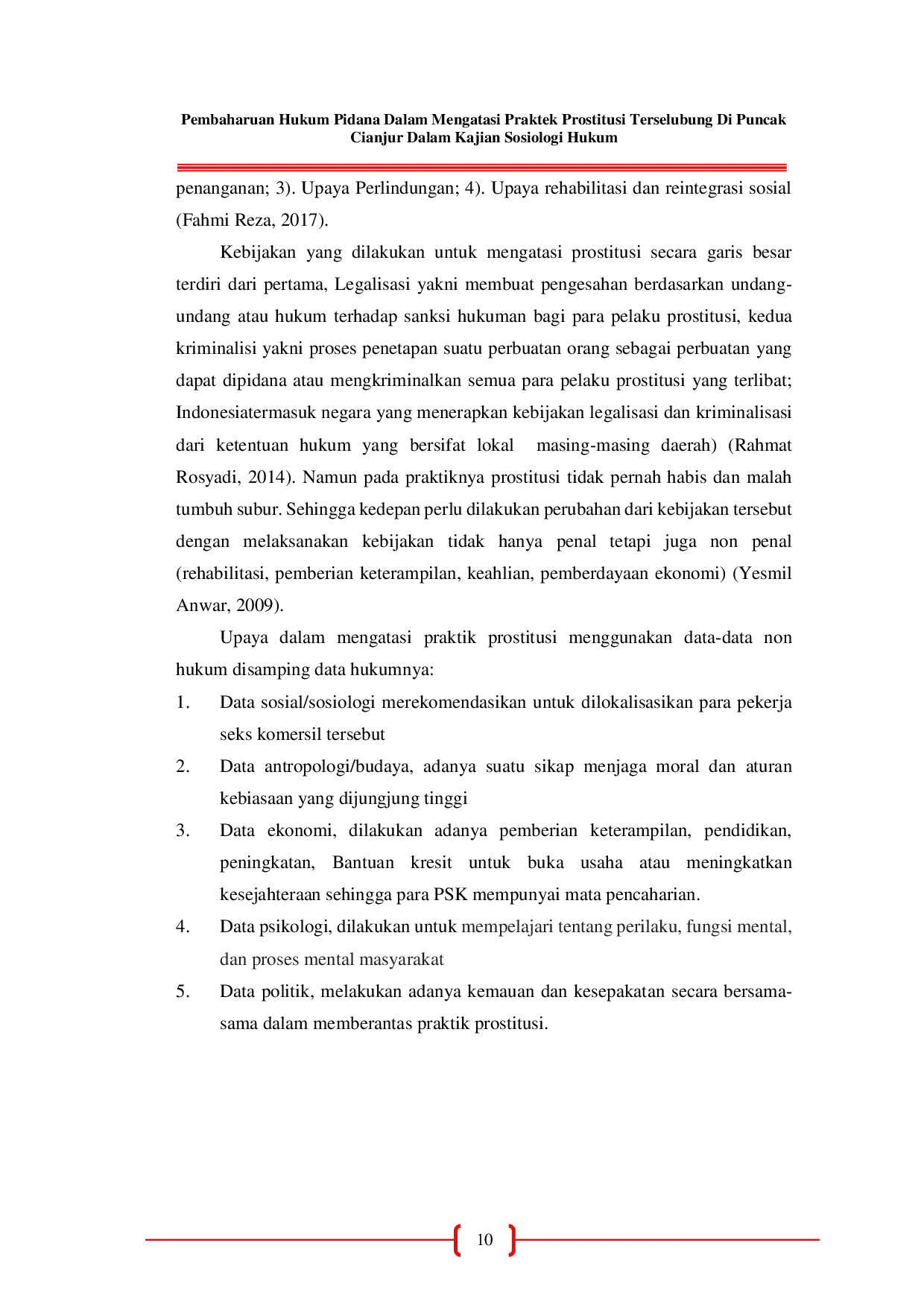 PROCEEDING JUSTICIA CONFERENCEPROCEEDING JUSTICIA CONFERENCEPraktik prostitusi menjadi fenomena sosial yang marak terjadi di wilayah Puncak Cianjur. Bentuknya tidak hanya secara terang-terangan tetapi ada yang secara terselubung. Salah satunya adalah praktik prostitusi berbalut kawin kontrak. Dengan adanya regulasi KUHP terbaru 2023, diharapkan dapat menjerat baik pelaku prostitusi maupun pengguna jasa prostitusi. Permasalahan yang diangkat adalah apakah para pengguna dan pelaku prostitusi dapat dijerat secara hukum, serta upaya apa yang dilakukan dalam pembaharuan hukum terhadap praktik prostitusi terselubung di Puncak Cianjur. Metode penelitian yang digunakan secara yuridis normatif merupakan penelitian yang difokuskan untuk mengkaji penerapan kaidah atau norma, kemudian dihubungkan dengan permasalahan yang berkaitan dengan prostitusi. Pengaturan prostitusi dalam KUHP mengatur standar moral konservatif yang masuk ke dalam pasal perzinahan. Sementara itu, upaya mengatasi prostitusi dilakukan dengan kebijakan penal dan kebijakan non penal.