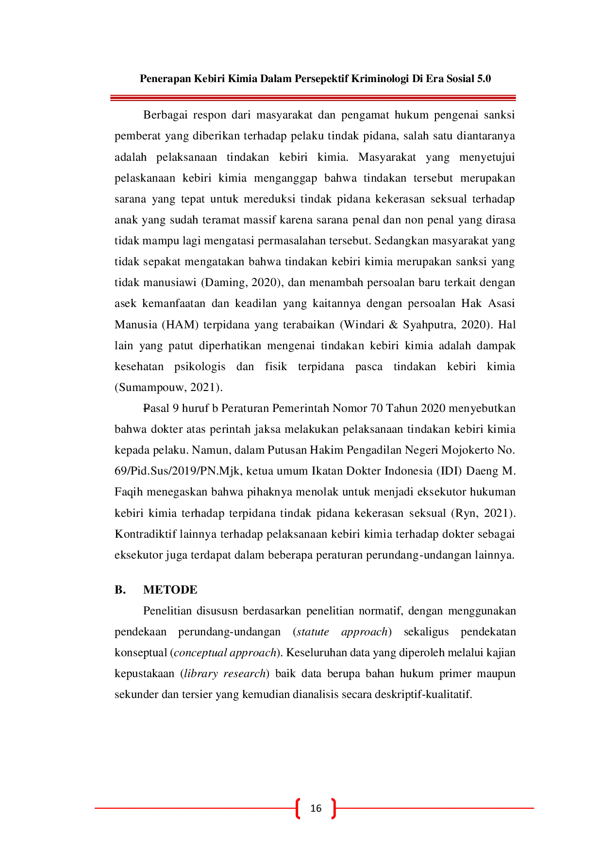 PROCEEDING JUSTICIA CONFERENCEPROCEEDING JUSTICIA CONFERENCEPenerapan sanksi kebiri kimia merupakan langkah tegas Pemerintah Indonesia dalam menangani kasus kekerasan seksual terhadap anak. Adanya kebijakan tersebut menjadi perhatian publik, dan pelaksanaan penegakan hukum yang tegas semakin dinanti masyarakat. Dokter sebagai eksekutor kebiri kimia sebagaimana Pasal 9 huruf b Peraturan Pemerintah Nomor 70 Tahun 2020 menyatakan penolakannya melalui Fatwa Kedokteran karena dianggap bertentangan dengan kode etik kedokteran, disiplin profesional dokter, praktik kedokteran, serta menganggap bahwa kebiri kimia merupakan intervensi kesehatan dan bukan merupakan pelayanan kesehatan. Tak hanya itu, efektivitas dari sanksi kebiri kimia juga belum teruji pelaksanaannya secara double blind. Melihat kondisi tersebut tentu menjadi polemik yang harus segera dituntaskan. Oleh karena itu, untuk mendukung pelaksanaannya harus melibatkan seluruh komponen, baik hukum, maupun sarana dan prasarana penegakan hukum. Tujuan penelitian ini untuk mengetahui latar belakang penerapan sanksi kebiri kimia, konsekuensi dari penolakan dokter dalam pelaksanaan kebiri kimia, dan implementasi sanksi kebiri kimia di Indonesia dalam kacamata kriminologi. Metode yang digunakan dalam penelitian ini adalah metode triangulasi data untuk memperoleh kebenaran informasi yang konkrit berdasarkan pendekatan yuridis normatif. Hasil penelitian ini diharapkan dapat memberikan masukan bagi penegak hukum dalam menanggulangi kekerasan seksual melalui kebiri kimia, dan sebagai pedoman untuk perlindungan terhadap anak sebagai korban kekerasan seksual melalui pendekatan kriminologi.