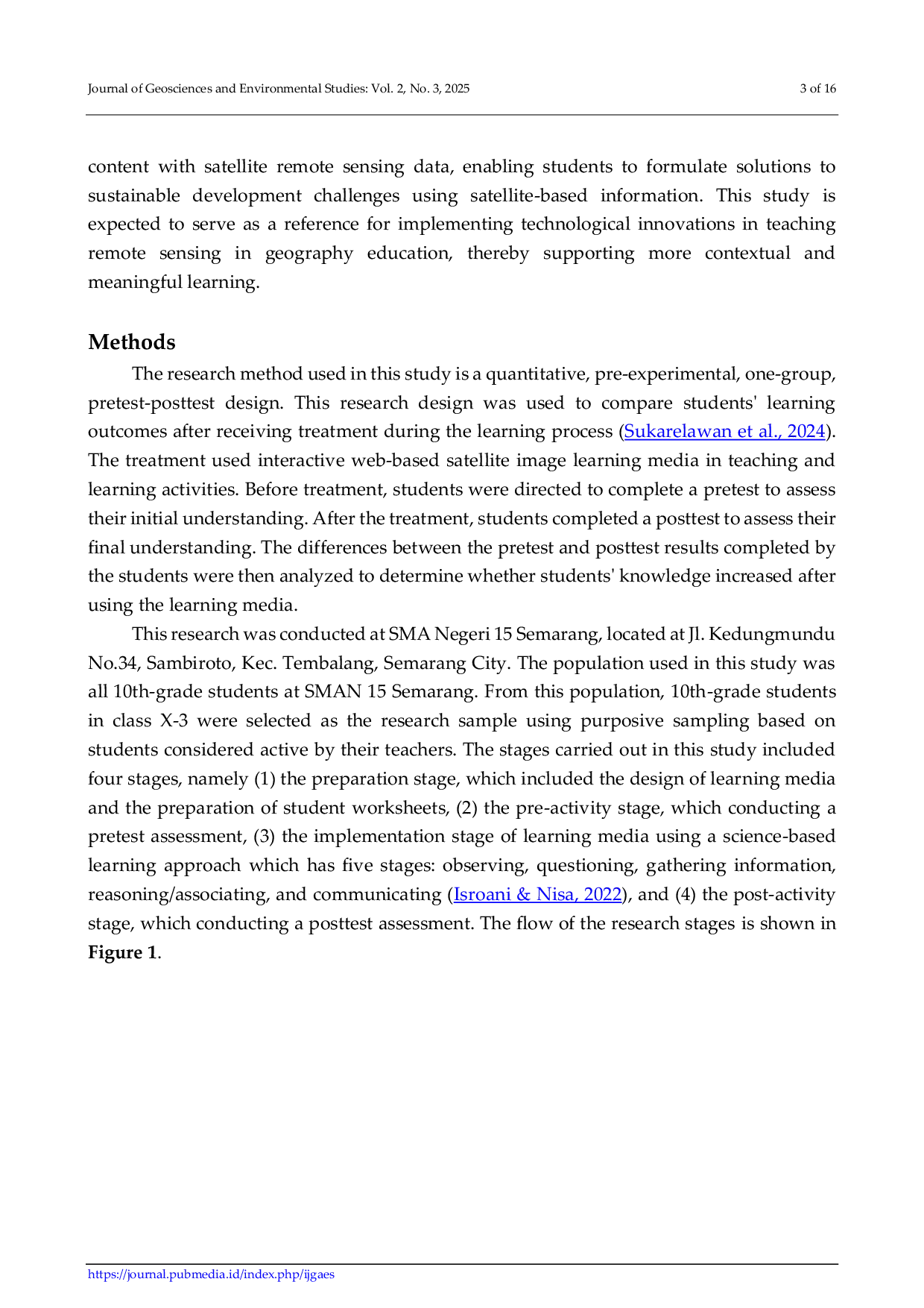 Journal of Geosciences and Environmental StudiesJournal of Geosciences and Environmental StudiesThe problem in teaching Sustainable Development Goals (SDGs) at the high school level is the lack of utilization of technology and the lack of contextual and interactive learning resources. This study aims to develop and implement interactive web-based satellite imagery as a learning media to improve students understanding of SDG issues, particularly those related to the environment. The interactive web application was developed using the Google Earth Engine platform and Landsat 8, Sentinel-1, Sentinel-2, and Sentinel-5 data. The research method used was a pre-experimental design with a pretest-posttest group. The research subjects were 10th-grade social studies students at SMAN 15 Semarang studying geography lessons on maps, remote sensing, and geographic information systems. Data were collected through observation and tests. A science-based learning approach guided classroom teaching and learning. The results showed that integrating satellite image-based learning media into an interactive web platform increased students understanding of the SDGs and remote sensing technology by 11%. These results indicate that using remote sensing technology and an interactive web provides an innovative and contextual learning alternative in SDG-based geography education in schools.