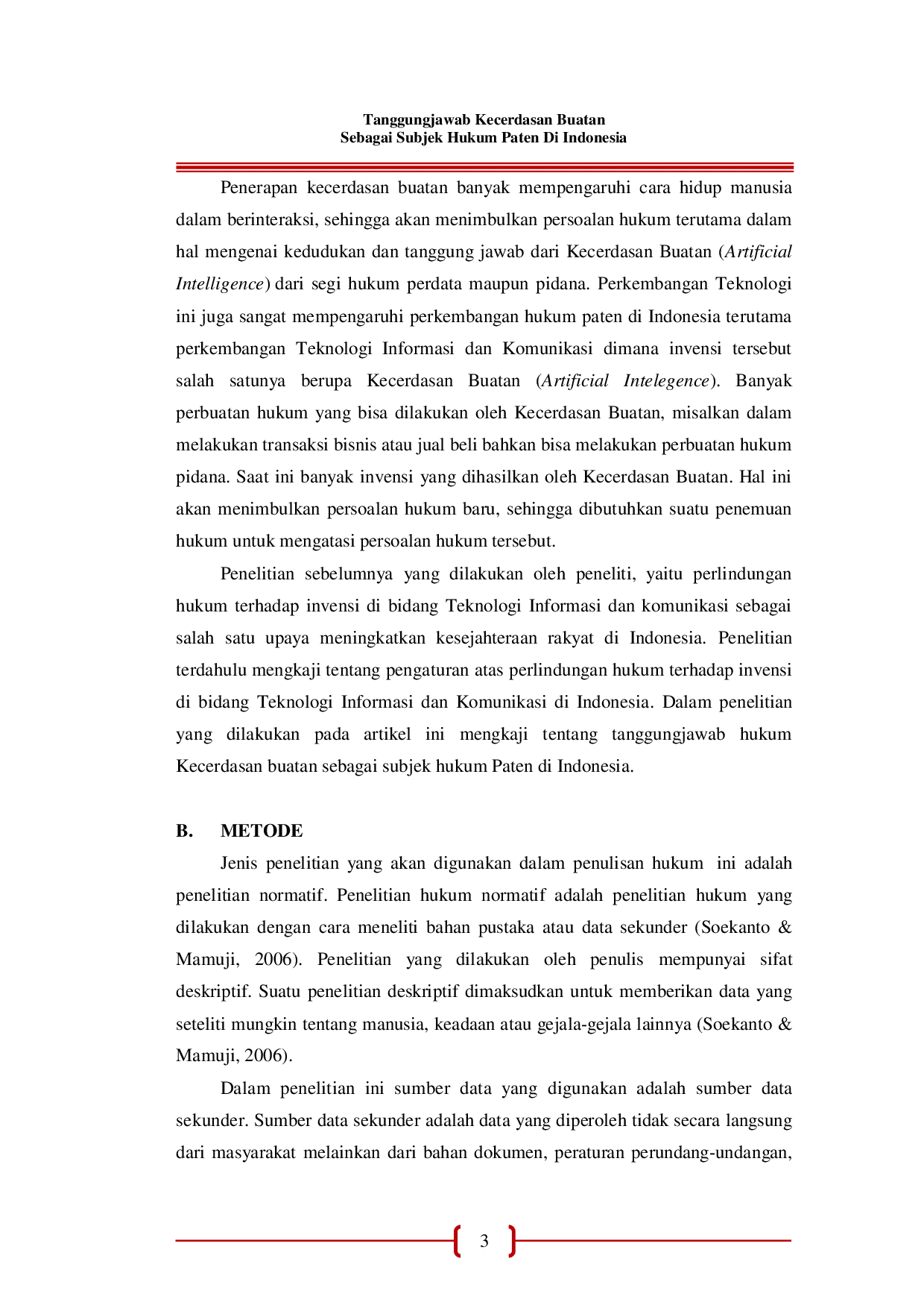 Kecerdasan Buatan hanya merupakan kepanjangan tangan manusia sebagai subjek hukum, ia bekerja sesuai program yang sudah disetting oleh manusia sebagai subjek hukum, oleh karena itu yang bertanggungjawab berdasarkan teori risk and liabilities.Kecerdasan Buatan tidak bertangungjawab atas kejadian yang tidak diharapkan dikemudian hari, baik secara perdata maupun secara administrasi bahkan secara pidana.Kecerdasan Buatan tidak menganut nilai-nilai dan etika, Kecerdasan buatan tidak punya hati nurani maka Kecerdasan Buatan tersebut tidak memiliki tangungjawab batin, yang dikenal dalam hukum pidana acteus dan mensrea, untuk dapat seseorang atau subjek hukum dapat di pidana maka subjek hukum tersebut memenuhi dua kualifikasi yaitu perbuatan dan pertangungjawabannya.Kecerdasan Buatan tidak mempunyai hak dan kewajiban sebagaimana yang dimiliki seorang Inventor tetapi kecerdasan buatan dapat menjadi objek Paten/ invensi dan berhak mendapatkan perlindungan hukum.
