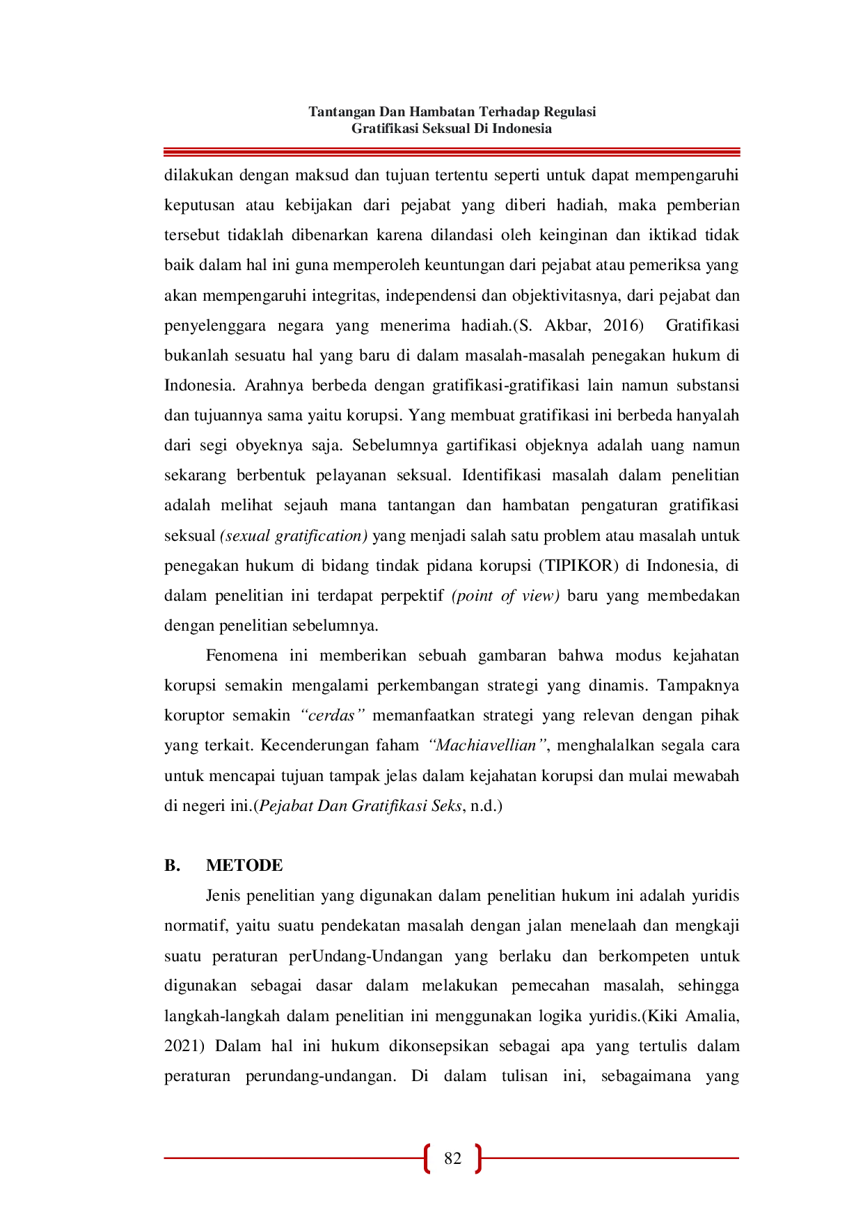 Pengaturan mengenai tindak pidana korupsi (TIPIKOR) terhadap gratifikasi merujuk pada Pasal 12 B Undang-Undang Nomor 20 Tahun 2001 jo Undang-Undang Nomor 31 Tahun 1999 tentang Tindak Pidana Korupsi belumlah bisa mengkriminalisasi dengan baik bentuk perkembangan gratifikasi seperti dengan banyaknya kasus praktik gratifikasi seksual di Indonesia.Penegakan hukum terhadap tindak pidana korupsi terkait gratifikasi seksual mengalami banyak tantangan dan hambatan.seperti faktor hukumnya itu sendiri (legal substance) dan faktor penegak hukum (legal structure).Demi mewujudkan pembaharuan hukum (legal reform) pidana secara progresif, perlu dilakukan kriminalisasi terhadap praktik gratifikasi seksual (sexual gratification).Mengingat pengaturan mengenai ini belum jelas baik pada Kitab Undang-Undang Hukum Pidana (KUHP) maupun peraturan perUndang-Undangan lainnya.Undang-Undang Tindak Pidana Korupsi (TIPIKOR) mengatur mengenai gratifikasi secara luas, namun justru menimbulkan ketidakpastian mengenai modus operandi lain terkait gratifikasi.