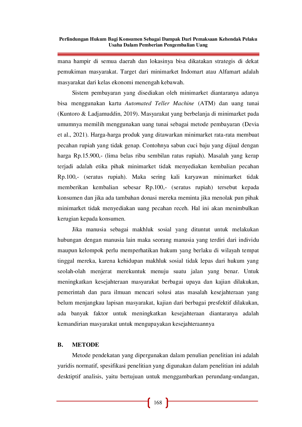PROCEEDING JUSTICIA CONFERENCEPROCEEDING JUSTICIA CONFERENCETindakan pelaku usaha di minimarket yang memberikan pengembalian uang bukan dalam bentuk uang atau tidak sesuai dengan jumlah yang seharusnya menimbulkan beberapa permasalahan yaitu pelanggaran terhadap hak-hak konsumen. Pelanggaran yang dilakukan oleh pelaku usaha menimbulkan kerugian untuk konsumen, kadang tanpa disadari oleh pelaku usaha dan konsumen itu sendiri. Pengalihan uang kembalian konsumen kedalam bentuk sumbangan atau donasi tanpa persetujuan konsumen adalah cacat kehendak dan dapat dikatakan sebagai pemaksaan kehendak pelaku usaha. Pelanggaran pelaku usaha kepada konsumen karena kurang mengertinya masyarakat dan pelaku usaha terhadap hak-hak konsumen dan menganggap hal tersebut adalah hal sepele.