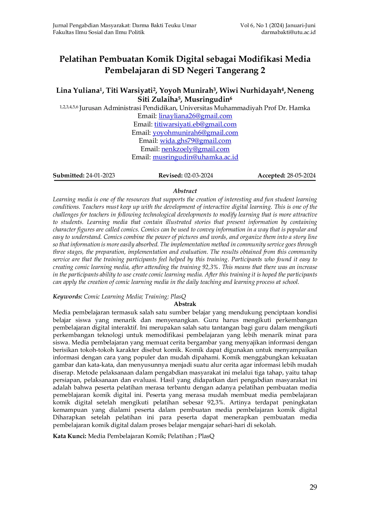 Berdasarkan hasil penelitian ini, beberapa saran penelitian lanjutan dapat diajukan. Pertama, perlu dilakukan penelitian lebih lanjut mengenai efektivitas penggunaan komik digital yang dibuat oleh guru dalam meningkatkan motivasi dan hasil belajar siswa di SDN Tangerang 2. Kedua, penelitian dapat difokuskan pada pengembangan model pelatihan pembuatan komik digital yang lebih komprehensif, termasuk materi tentang desain visual, penulisan naskah komik yang menarik, dan strategi implementasi komik dalam berbagai mata pelajaran. Ketiga, penelitian lanjutan dapat mengeksplorasi penggunaan aplikasi atau platform lain selain PlasQ dalam pembuatan komik digital, serta membandingkan kelebihan dan kekurangan masing-masing aplikasi untuk menemukan solusi yang paling efektif dan efisien bagi guru. Penelitian-penelitian ini diharapkan dapat memberikan kontribusi signifikan dalam pengembangan media pembelajaran yang inovatif dan berkualitas, serta meningkatkan kualitas pendidikan di tingkat sekolah dasar.