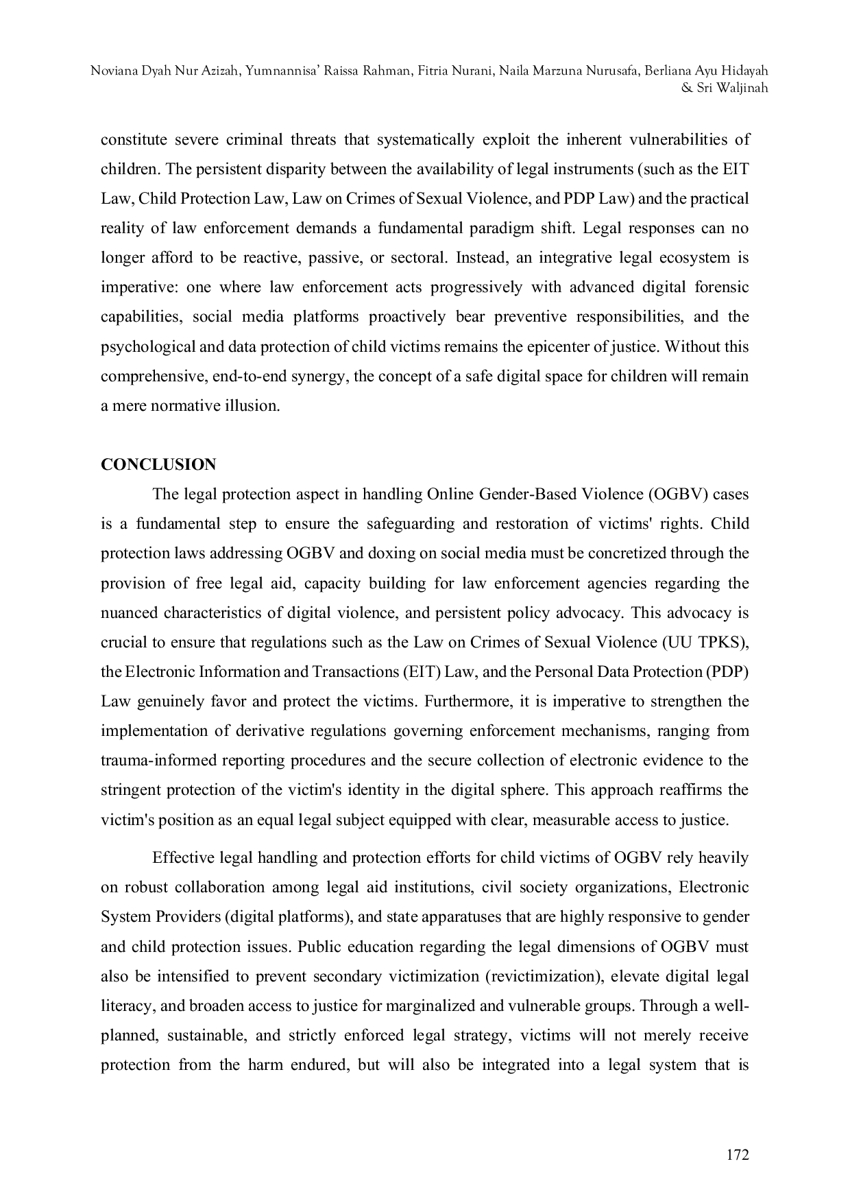 Perlindungan hukum terhadap korban Kekerasan Berbasis Gender Online (KBGO) anak, termasuk doxing, memerlukan konkretisasi melalui bantuan hukum gratis, peningkatan kapasitas penegak hukum, dan advokasi kebijakan agar regulasi yang ada benar-benar melindungi korban.Keberhasilan upaya penanganan dan perlindungan korban anak KBGO sangat bergantung pada kolaborasi kuat antarlembaga, termasuk penyedia platform digital, serta intensifikasi edukasi publik mengenai dimensi hukum KBGO untuk mencegah viktimisasi sekunder dan meningkatkan literasi digital.Dengan strategi hukum yang terencana, berkelanjutan, dan ditegakkan secara ketat, diharapkan tercipta lingkungan digital yang lebih aman, adil, dan akuntabel bagi perlindungan perempuan dan anak secara komprehensif.
