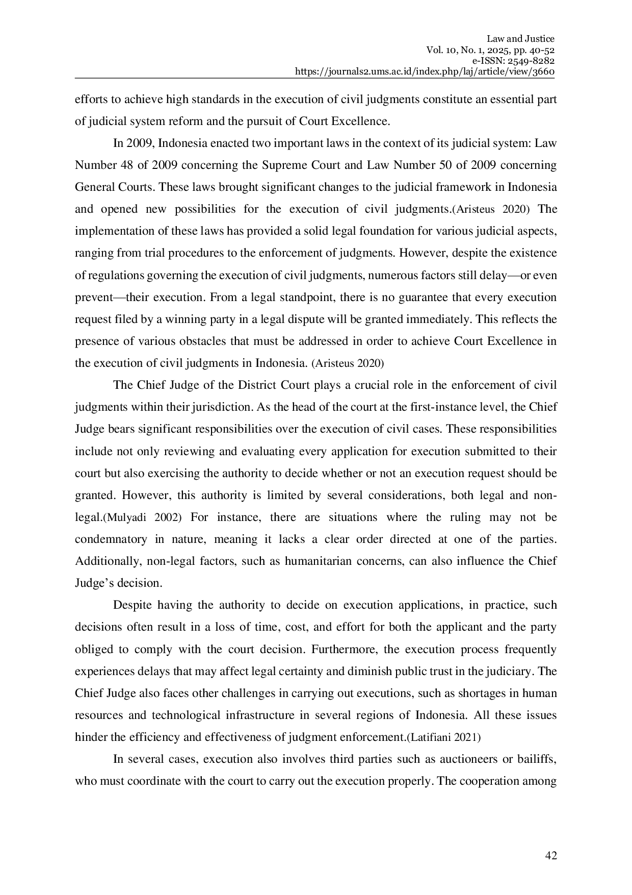 Law and JusticeLaw and JusticePenelitian ini membahas transformasi eksekusi putusan perdata sebagai langkah penting menuju Court Excellence di Indonesia. Isu utama yang diteliti adalah permasalahan pelaksanaan eksekusi putusan pengadilan perdata yang seringkali menghadapi tantangan yang menghambat prosesnya. Penelitian ini bertujuan untuk mengidentifikasi masalah utama dalam eksekusi perdata, menguraikan peran Court Excellence dalam sistem peradilan Indonesia, dan memberikan langkah-langkah konkret untuk meningkatkan efisiensi dan efektivitas eksekusi. Metode penelitian yang digunakan adalah metode yuridis normatif, dengan pendekatan analisis terhadap peraturan perundang-undangan, doktrin hukum, serta putusan-putusan pengadilan yang relevan. Temuan penelitian ini mengungkapkan bahwa kendala utama dalam eksekusi mencakup biaya yang belum terpenuhi, perlawanan oleh pihak ketiga, permasalahan dalam redaksi putusan, ketidakmampuan pemohon eksekusi menunjukkan harta, objek yang ditunjukkan tidak ditemukan, dan kesulitan dalam melaksanakan eksekusi terhadap putusan pengadilan. Transformasi eksekusi putusan perdata melibatkan perbaikan dalam redaksi putusan, koordinasi yang lebih baik, pengawasan yang ketat, pelatihan dan edukasi, serta pembentukan unit khusus di Mahkamah Agung. Hasil penelitian ini menyoroti pentingnya transformasi eksekusi putusan perdata sebagai bagian integral dari upaya mencapai Court Excellence di Indonesia. Transformasi ini diharapkan akan meningkatkan efisiensi dan efektivitas pelaksanaan eksekusi, menciptakan peradilan yang lebih berwibawa, dan memastikan keadilan serta kepatuhan terhadap hukum dalam masyarakat.