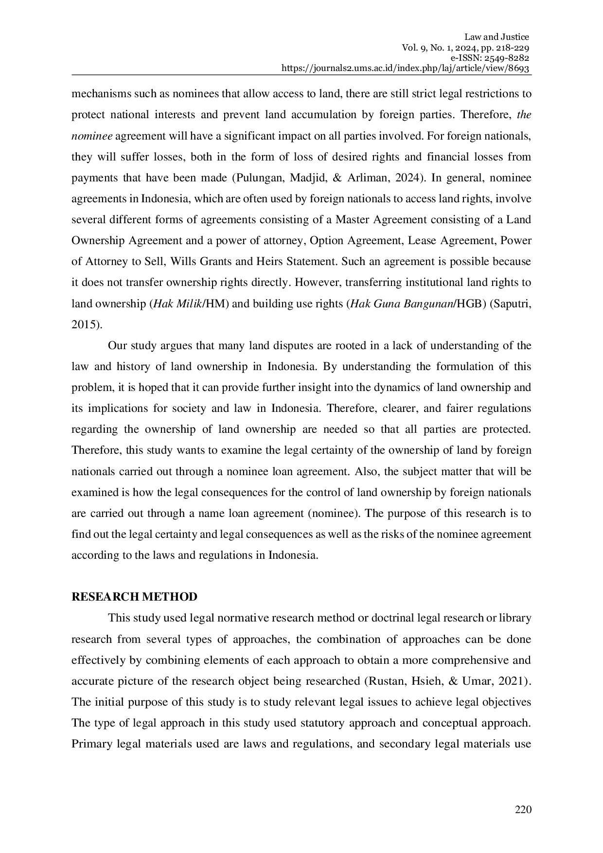 - Legal Certainty of Land Ownership Rights By Foreign Nationals Through Nominee Agreements | Law and Justice.... doi.org/10.23917/laj.v9i1.8693Legal Certainty of Land Ownership Rights By Foreign Nationals Through Nominee Agreements Law and Justice doi 10 23917 laj v9i1 8693