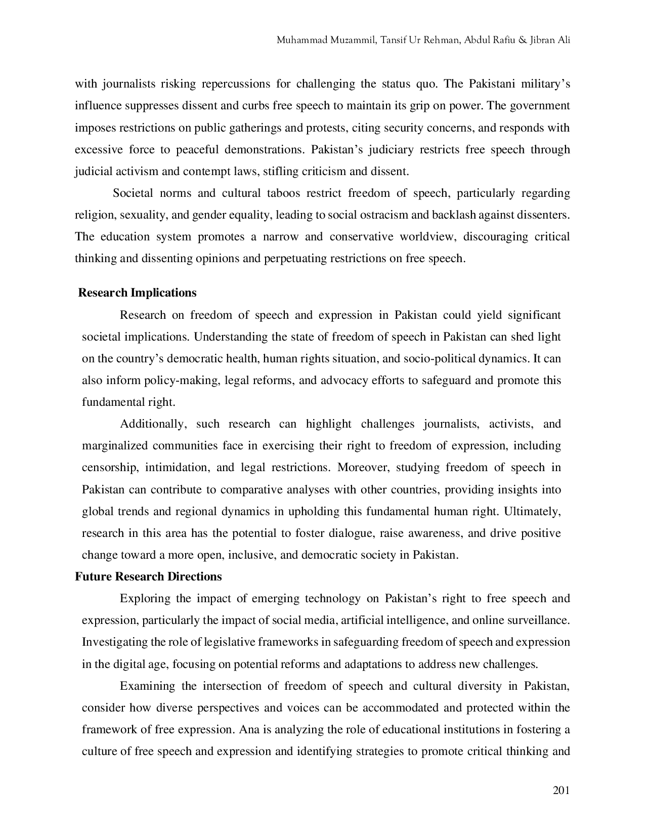 Penelitian lanjutan perlu mengkaji lebih dalam implementasi dan penegakan hukum terkait kebebasan berbicara di Pakistan, khususnya bagaimana interpretasi yudisial dan praktik administratif memengaruhi hak ini di lapangan, bukan hanya pada level undang-undang formal. Studi dapat menganalisis secara kualitatif dampak putusan pengadilan dan kebijakan pemerintah terhadap pengalaman kelompok minoritas dan perempuan dalam menyuarakan pendapat, mengingat adanya keterbatasan yang dialami perempuan dalam berbagai aspek kehidupan serta eksploitasi kelompok minoritas yang disebutkan. Selain itu, penting untuk mengeksplorasi secara komprehensif mekanisme informal yang membatasi kebebasan berbicara, seperti norma sosial, tabu budaya, dan pengaruh aktor non-negara, termasuk peran militer yang kuat, yang mendorong praktik sensor diri di kalangan jurnalis dan warga. Pertanyaan penelitian dapat mencakup bagaimana tekanan sosial dan budaya ini berinteraksi dengan kerangka hukum formal untuk membentuk lanskap kebebasan berekspresi. Terakhir, mengingat temuan bahwa sistem pendidikan turut berkontribusi pada intoleransi, penelitian lanjutan dapat merancang dan menguji model kurikulum serta pedagogi inovatif yang secara efektif menumbuhkan pemikiran kritis, literasi media, dan toleransi terhadap keberagaman pandangan di kalangan generasi muda, sehingga mereka lebih siap menghadapi misinformasi dan ujaran kebencian di era digital. Hal ini akan memperkuat ketahanan masyarakat dalam mempertahankan ruang dialog yang sehat dan inklusif.