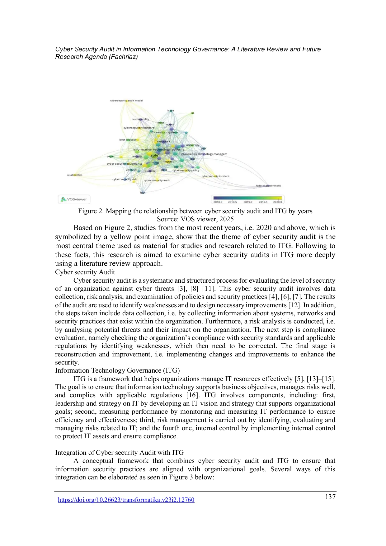 Audit keamanan siber dan Tata Kelola Teknologi Informasi adalah dua komponen kunci yang diperlukan untuk menjaga keamanan informasi dan mengelola teknologi informasi secara efektif.Integrasi antara keduanya dalam kerangka konseptual membantu organisasi mengidentifikasi, mengelola, dan meredam risiko siber sambil menjaga keselarasan dengan tujuan bisnis.Memahami hubungan ini dengan baik adalah langkah penting untuk menghadapi tantangan keamanan siber yang semakin kompleks di era digital saat ini.Studi masa depan direkomendasikan untuk mengembangkan penelitian ini, seperti menggali informasi mendalam dengan mitra eksternal tentang keamanan siber dan ITG, meningkatkan kedalaman informasi antara auditor internal dan manajemen keamanan siber.Selain itu, penelitian masa depan juga perlu menambahkan beberapa variabel lain, termasuk variabel untuk mengukur persepsi profesional tentang keamanan informasi, variabel manajemen risiko untuk meningkatkan efektivitas manajemen keamanan informasi dan tata kelola TI secara menyeluruh.Variabel auditor internal yang ahli berperan sebagai pengganti dewan direksi jika tidak ada dewan direksi yang menguasai audit keamanan siber dalam ITG.Oleh karena itu, tema audit keamanan siber yang relatif baru dapat berjalan dinamis sesuai dengan perkembangan IoT dan kecerdasan buatan (AI).