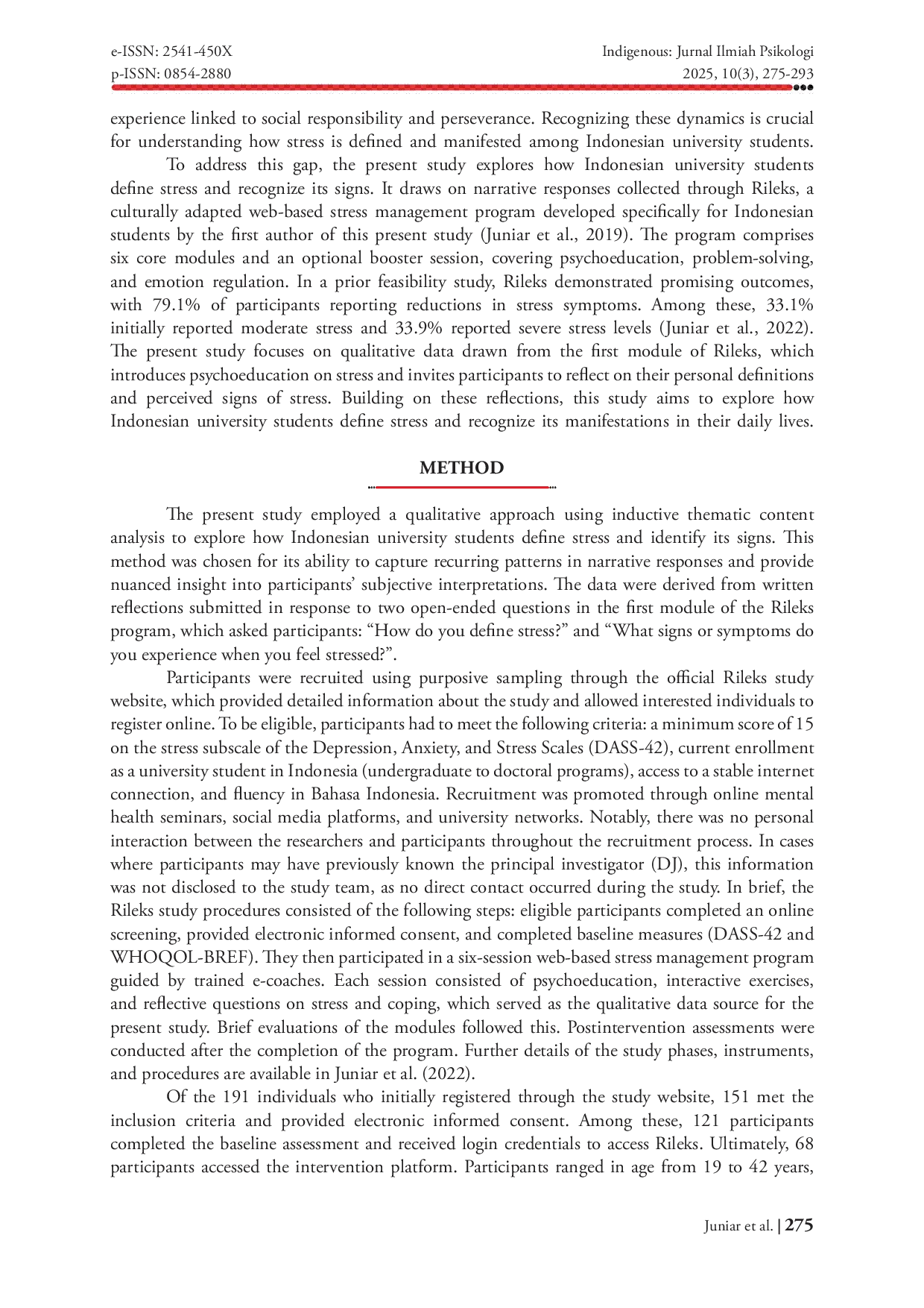 Indigenous: Jurnal Ilmiah PsikologiIndigenous: Jurnal Ilmiah PsikologiMeskipun berbagai studi telah mendokumentasikan prevalensi stres di kalangan mahasiswa, perhatian terbatas diberikan pada bagaimana mahasiswa mendefinisikan dan mengalaminya. Studi ini, sebagai bagian dari investigasi yang lebih besar terhadap Rileks, sebuah program manajemen stres berbasis web yang diadaptasi secara budaya untuk mahasiswa Indonesia, meneliti bagaimana mahasiswa mengkonseptualisasikan stres dan mengidentifikasi tanda-tandanya. Sebanyak 68 peserta, mayoritas perempuan dan berusia antara 19 hingga 42 tahun, berpartisipasi dalam studi ini. Mereka terdaftar dalam program sarjana hingga doktoral dan direkrut melalui convenience sampling via platform studi Rileks. Analisis konten tematik dilakukan pada tanggapan pertanyaan terbuka di modul pertama Rileks, yang menanyakan definisi stres dan tanda-tanda yang dialami mahasiswa. Pengodean dilakukan secara manual menggunakan Excel, dan pemeriksaan reliabilitas antar-penilai diterapkan untuk meningkatkan ketelitian analitis. Tiga tema utama muncul dalam definisi stres mahasiswa: tekanan atau ketegangan yang dirasakan, keadaan yang melebihi kapasitas koping, dan stres sebagai kondisi gangguan. Tema minor adalah stres sebagai faktor pendorong. Setiap tema utama mencakup berbagai bidang kehidupan mahasiswa, melampaui masalah akademik, dan beberapa tanggapan mencerminkan nilai-nilai budaya seperti harapan keluarga dan tuntutan masyarakat. Mahasiswa juga menggambarkan tanda-tanda stres di empat domain: fisik, kognitif, emosional, dan perilaku. Temuan ini menunjukkan bahwa persepsi mahasiswa tentang stres mungkin dibentuk oleh faktor pribadi dan kontekstual, menawarkan implikasi praktis untuk meningkatkan pengenalan dini dan komunikasi stres mahasiswa melalui pendekatan yang relevan dan sensitif secara budaya.