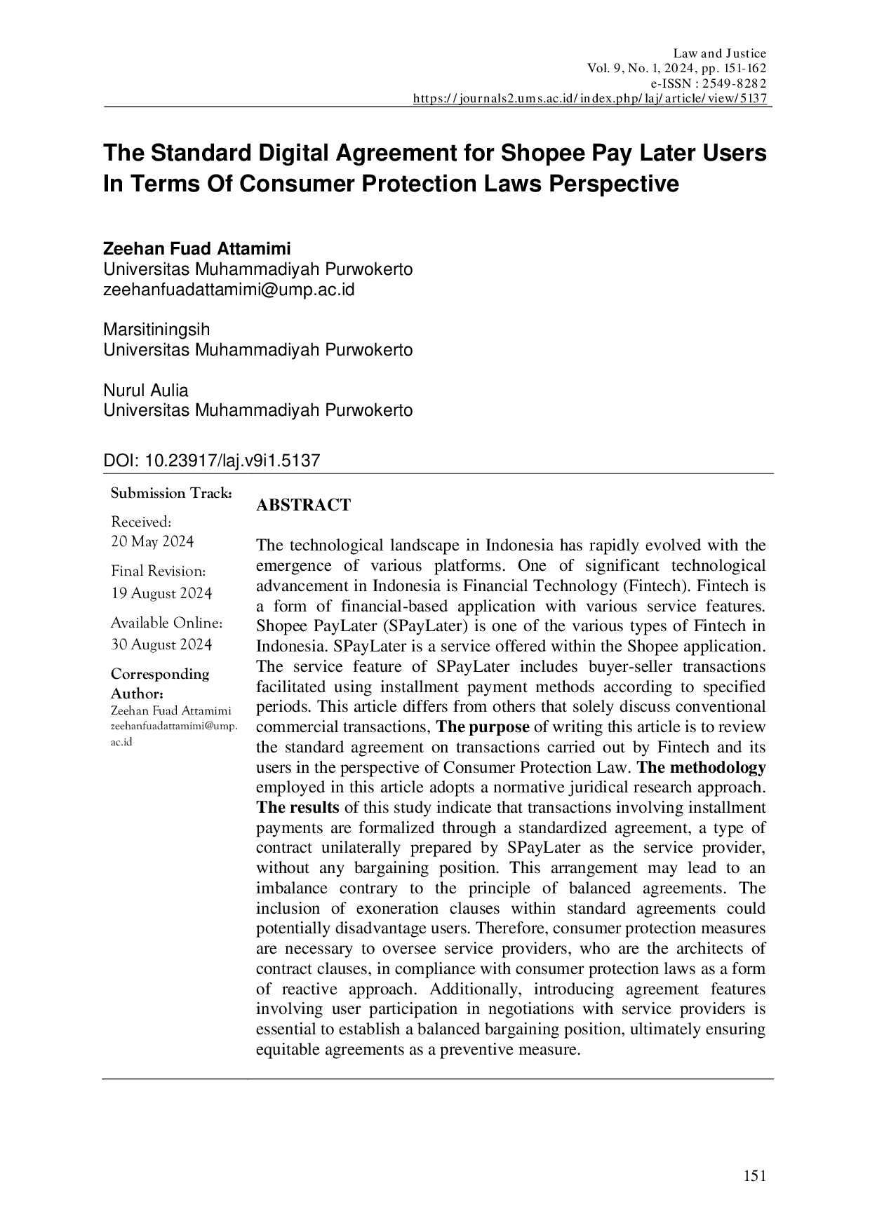 Law and JusticeLaw and JusticeLanskap teknologi di Indonesia telah berkembang pesat dengan munculnya berbagai platform. Salah satu kemajuan teknologi yang signifikan di Indonesia adalah Teknologi Finansial (Fintech). Fintech adalah bentuk aplikasi berbasis keuangan dengan berbagai fitur layanan. Shopee PayLater (SPayLater) adalah salah satu dari berbagai jenis Fintech di Indonesia. SPayLater adalah layanan yang ditawarkan dalam aplikasi Shopee. Fitur layanan SPayLater mencakup transaksi jual beli yang difasilitasi menggunakan metode pembayaran cicilan sesuai periode yang ditentukan. Artikel ini bertujuan untuk meninjau perjanjian baku pada transaksi yang dilakukan oleh Fintech dan penggunanya dalam perspektif Hukum Perlindungan Konsumen. Metodologi yang digunakan mengadopsi pendekatan penelitian yuridis normatif. Hasil penelitian ini menunjukkan bahwa transaksi pembayaran cicilan diformalkan melalui perjanjian baku yang disiapkan secara sepihak oleh SPayLater sebagai penyedia layanan, tanpa posisi tawar-menawar. Pengaturan ini dapat menyebabkan ketidakseimbangan yang bertentangan dengan prinsip perjanjian yang seimbang dan berpotensi merugikan pengguna melalui klausula eksonerasi. Oleh karena itu, langkah-langkah perlindungan konsumen diperlukan untuk mengawasi penyedia layanan sesuai undang-undang perlindungan konsumen sebagai pendekatan reaktif. Selain itu, memperkenalkan fitur perjanjian yang melibatkan partisipasi pengguna dalam negosiasi dengan penyedia layanan sangat penting untuk membangun posisi tawar yang seimbang, pada akhirnya memastikan perjanjian yang adil sebagai tindakan preventif.