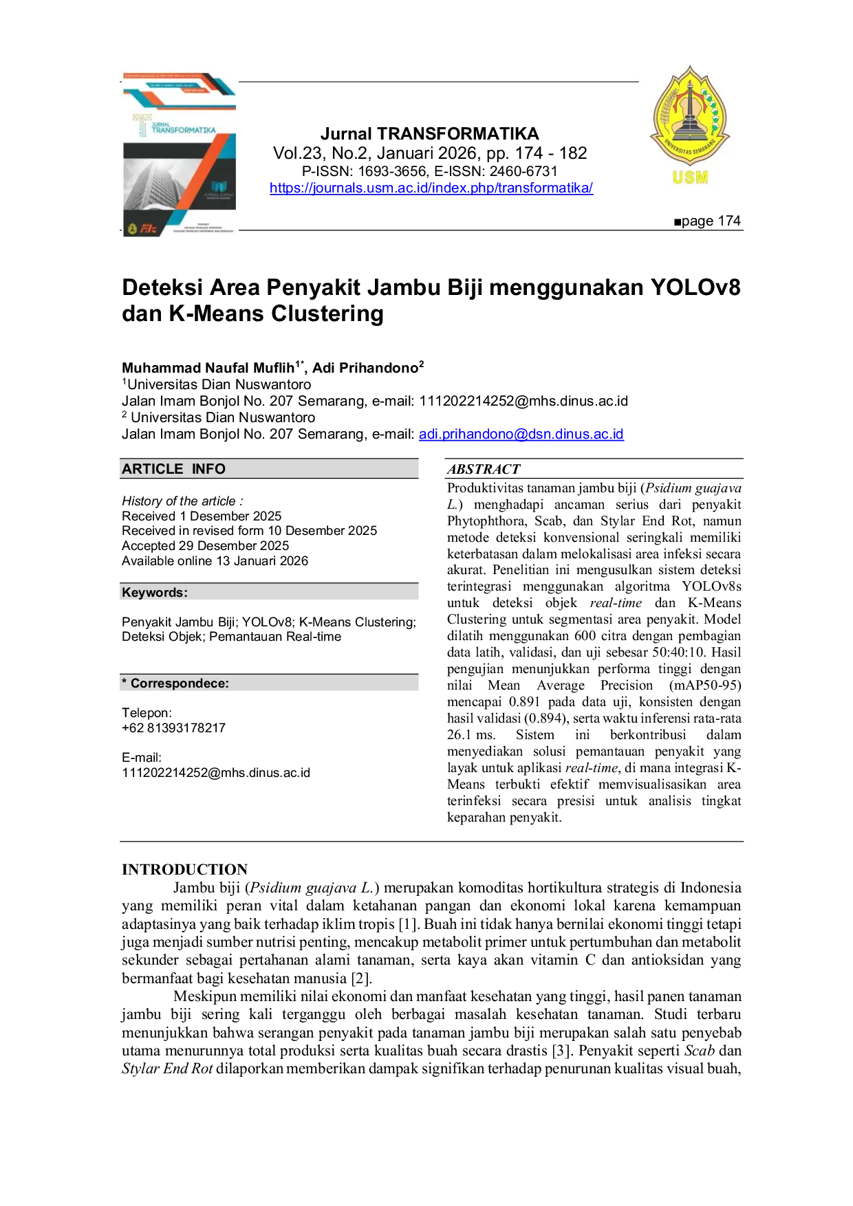Jurnal TransformatikaJurnal TransformatikaProduktivitas tanaman jambu biji (Psidium guajava L.) menghadapi ancaman serius dari penyakit Phytophthora, Scab, dan Stylar End Rot, namun metode deteksi konvensional seringkali memiliki keterbatasan dalam melokalisasi area infeksi secara akurat. Penelitian ini mengusulkan sistem deteksi terintegrasi menggunakan algoritma YOLOv8s untuk deteksi objek real-time dan K-Means Clustering untuk segmentasi area penyakit. Model dilatih menggunakan 600 citra dengan pembagian data latih, validasi, dan uji sebesar 50:40:10. Hasil pengujian menunjukkan performa tinggi dengan nilai Mean Average Precision mencapai 0.891 pada data uji, konsisten dengan hasil validasi (0.894), serta waktu inferensi rata-rata 26.1 ms. Sistem ini berkontribusi dalam menyediakan solusi pemantauan penyakit yang layak untuk aplikasi real-time, di mana integrasi K-Means terbukti efektif memvisualisasikan area terinfeksi secara presisi untuk analisis tingkat keparahan penyakit.