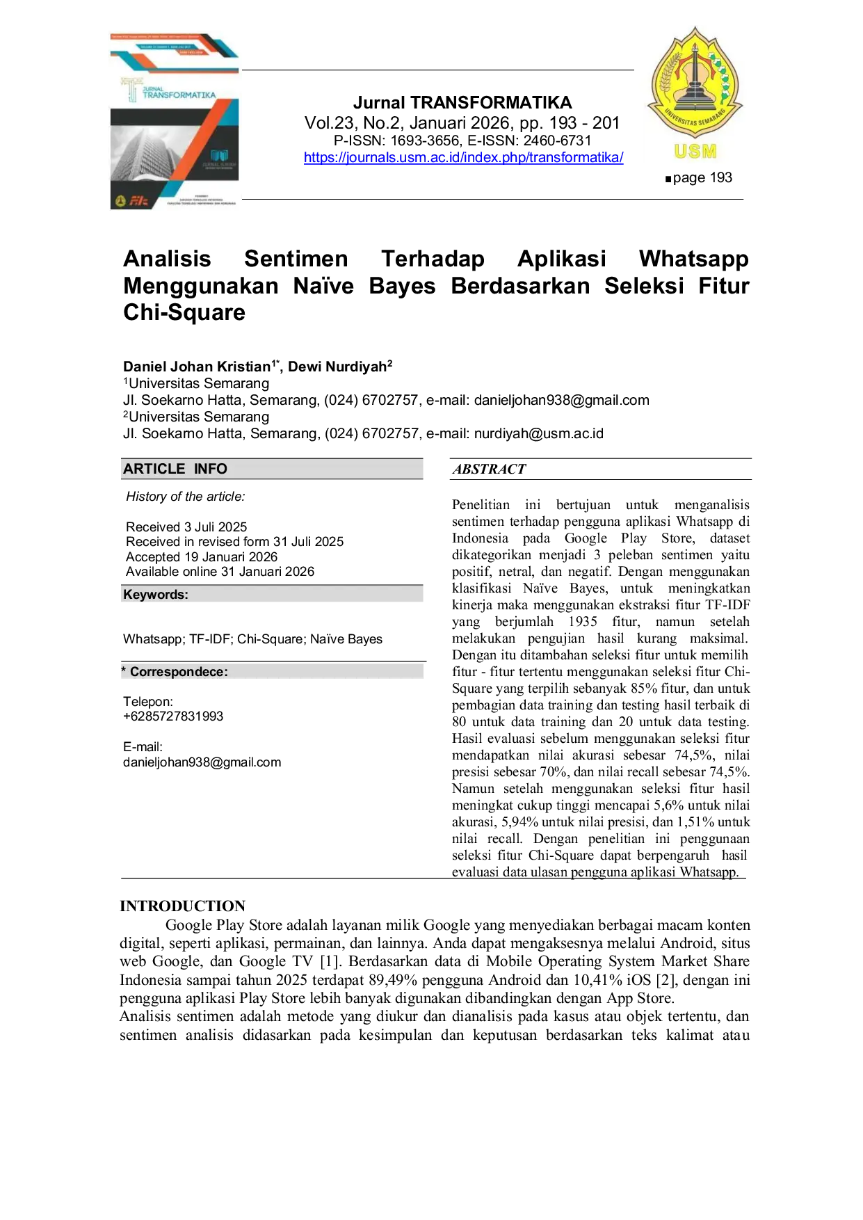 - Analisis Sentimen Terhadap Aplikasi Whatsapp Menggunakan Naïve Bayes Berdasarkan Seleksi Fitur Chi-Square... journals.usm.ac.id/index.php/transformatika/article/view/12310Analisis Sentimen Terhadap Aplikasi Whatsapp Menggunakan Nayve Bayes Berdasarkan Seleksi Fitur Chi Square journals usm ac index php transformatika article view 12310