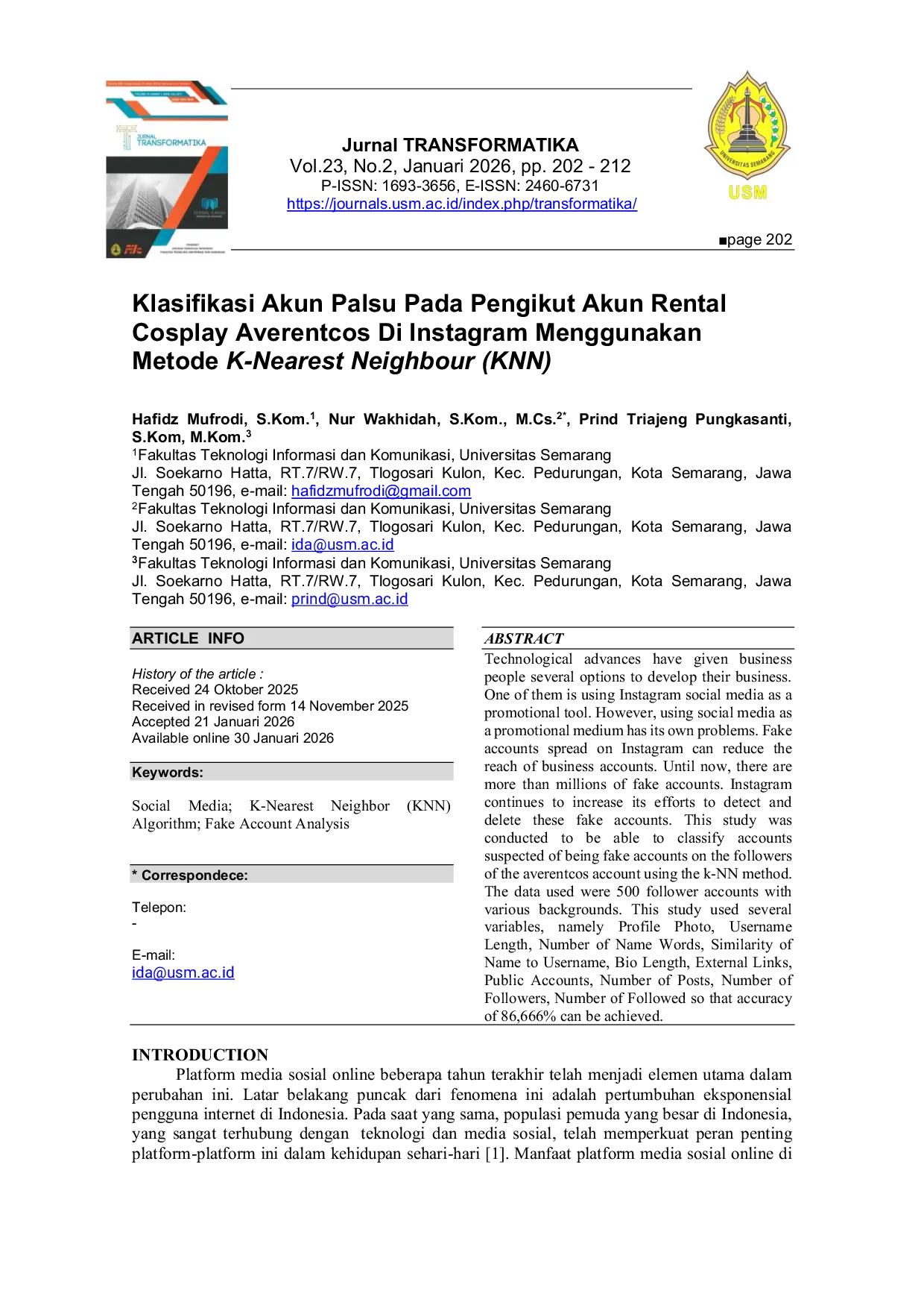 Jurnal TransformatikaJurnal TransformatikaKemajuan teknologi telah memberikan berbagai opsi bagi pelaku bisnis untuk mengembangkan usaha mereka. Salah satunya adalah dengan memanfaatkan media sosial Instagram sebagai alat promosi. Namun, penggunaan media sosial sebagai media promosi juga memiliki masalah tersendiri. Akun palsu yang tersebar di Instagram dapat mengurangi jangkauan akun bisnis. Penelitian ini bertujuan untuk mengklasifikasikan akun-akun yang dicurigai sebagai akun palsu pada pengikut akun averentcos menggunakan metode k-NN. Data yang digunakan adalah 500 akun pengikut dengan berbagai latar belakang. Penelitian ini menggunakan beberapa variabel, yaitu Foto Profil, Panjang Nama Pengguna, Jumlah Kata Nama, Kesamaan Nama dengan Nama Pengguna, Panjang Bio, Tautan Eksternal, Akun Publik, Jumlah Posting, Jumlah Pengikut, Jumlah yang Diikuti sehingga akurasi sebesar 86,666% dapat dicapai.