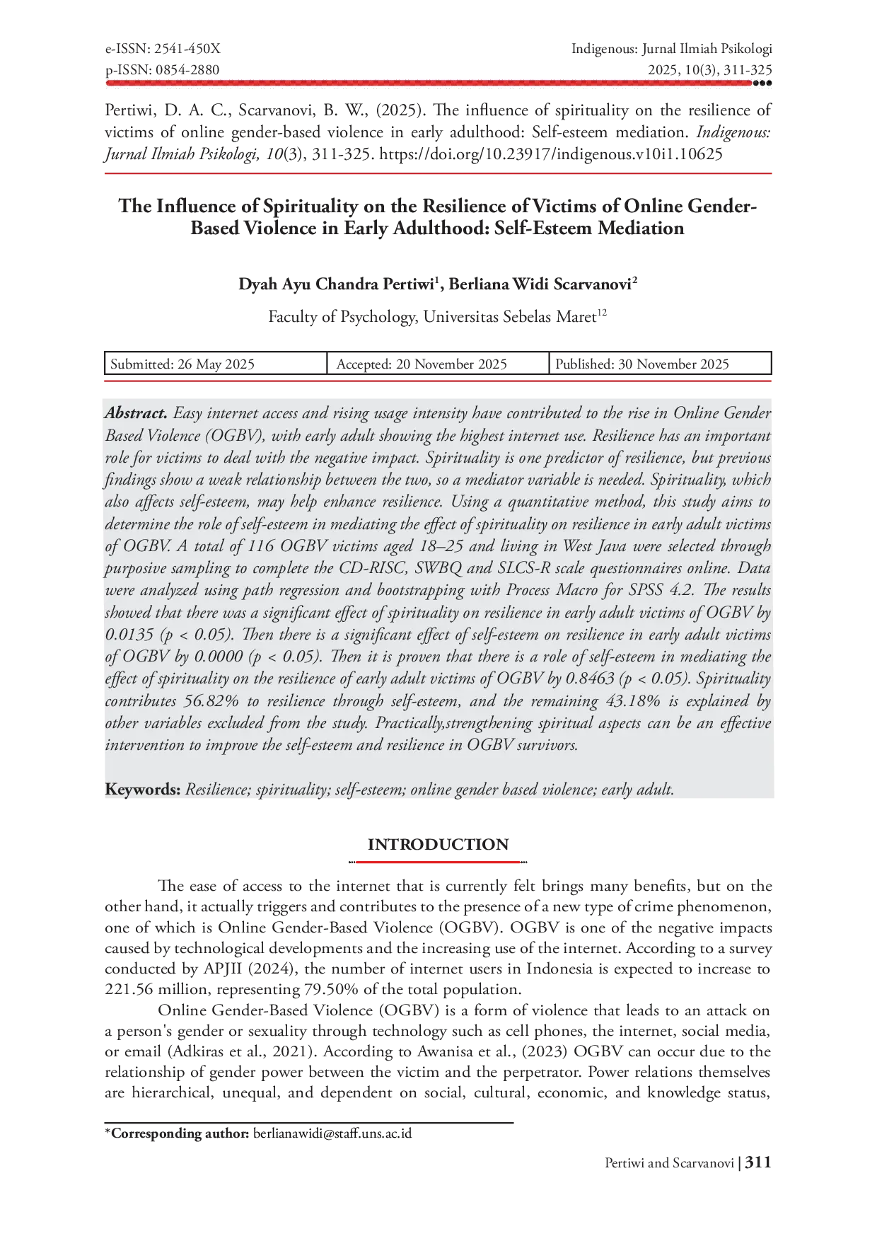 Indigenous: Jurnal Ilmiah PsikologiIndigenous: Jurnal Ilmiah PsikologiAkses internet yang mudah dan intensitas penggunaan yang meningkat telah berkontribusi pada peningkatan Kekerasan Berbasis Gender Online (KBGO), dengan dewasa muda menunjukkan penggunaan internet tertinggi. Ketahanan memiliki peran penting bagi para korban untuk mengatasi dampak negatif. Spiritualitas adalah salah satu prediktor ketahanan, tetapi temuan sebelumnya menunjukkan hubungan yang lemah antara keduanya, sehingga diperlukan variabel mediator. Spiritualitas, yang juga memengaruhi harga diri, dapat membantu meningkatkan ketahanan. Studi ini bertujuan untuk menentukan peran harga diri dalam memediasi pengaruh spiritualitas terhadap ketahanan pada dewasa muda korban KBGO. Sebanyak 116 korban KBGO berusia 18–25 tahun yang tinggal di Jawa Barat dipilih melalui purposive sampling untuk mengisi kuesioner skala CD-RISC, SWBQ, dan SLCS-R secara online. Data dianalisis menggunakan regresi jalur dan bootstrapping dengan Macro Proses untuk SPSS 4.2. Hasil penelitian menunjukkan bahwa terdapat pengaruh signifikan dari spiritualitas terhadap ketahanan pada dewasa muda korban KBGO sebesar 0,0135 (p < 0,05). Kemudian terdapat pengaruh signifikan dari harga diri terhadap ketahanan pada dewasa muda korban KBGO sebesar 0,0000 (p < 0,05). Kemudian terbukti bahwa terdapat peran harga diri dalam memediasi pengaruh spiritualitas terhadap ketahanan dewasa muda korban KBGO sebesar 0,8463 (p < 0,05). Spiritualitas berkontribusi 56,82% terhadap ketahanan melalui harga diri, dan sisanya 43,18% dijelaskan oleh variabel lain yang dikeluarkan dari penelitian. Praktis, penguatan aspek spiritual dapat menjadi intervensi yang efektif untuk meningkatkan harga diri dan ketahanan pada penyintas KBGO.
